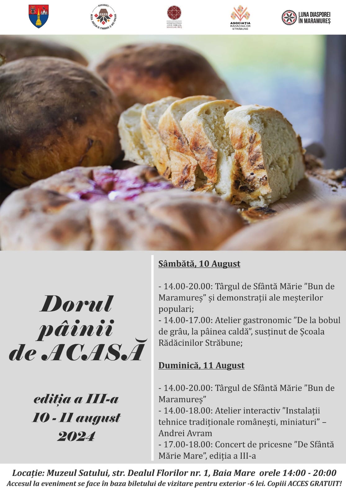În acest weekend, 10-11 august, la Muzeul Satului din Baia Mare va avea loc ediția a III-a a manifestării „Dorul pâinii de ACASĂ”.