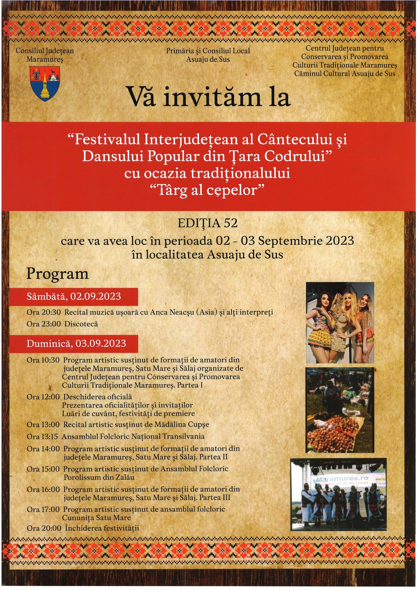 Dacă seara de sâmbătă a fost destinată tinerilor, duminica va aduce un regal folcloric, cu artiști de marcă din toate cele trei județe care alcătuiesc Țara Codrului.