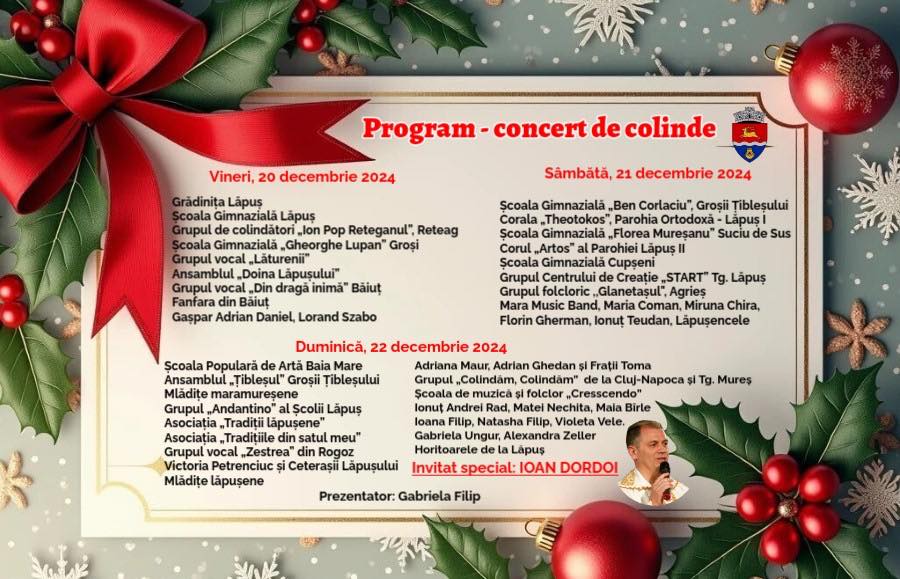 Dragii mei, haideți să fim împreună și să ne bucurăm de tradiții și obiceiuri, de valori moștenite, de tot ce înseamnă Sărbătoarea Crăciunului la Lăpuș! Mulțumim sponsorilor și tuturor celor care știu că doar împreună reușim! Vă așteptăm cu drag!”, transmite primarul Cristina Buda.
