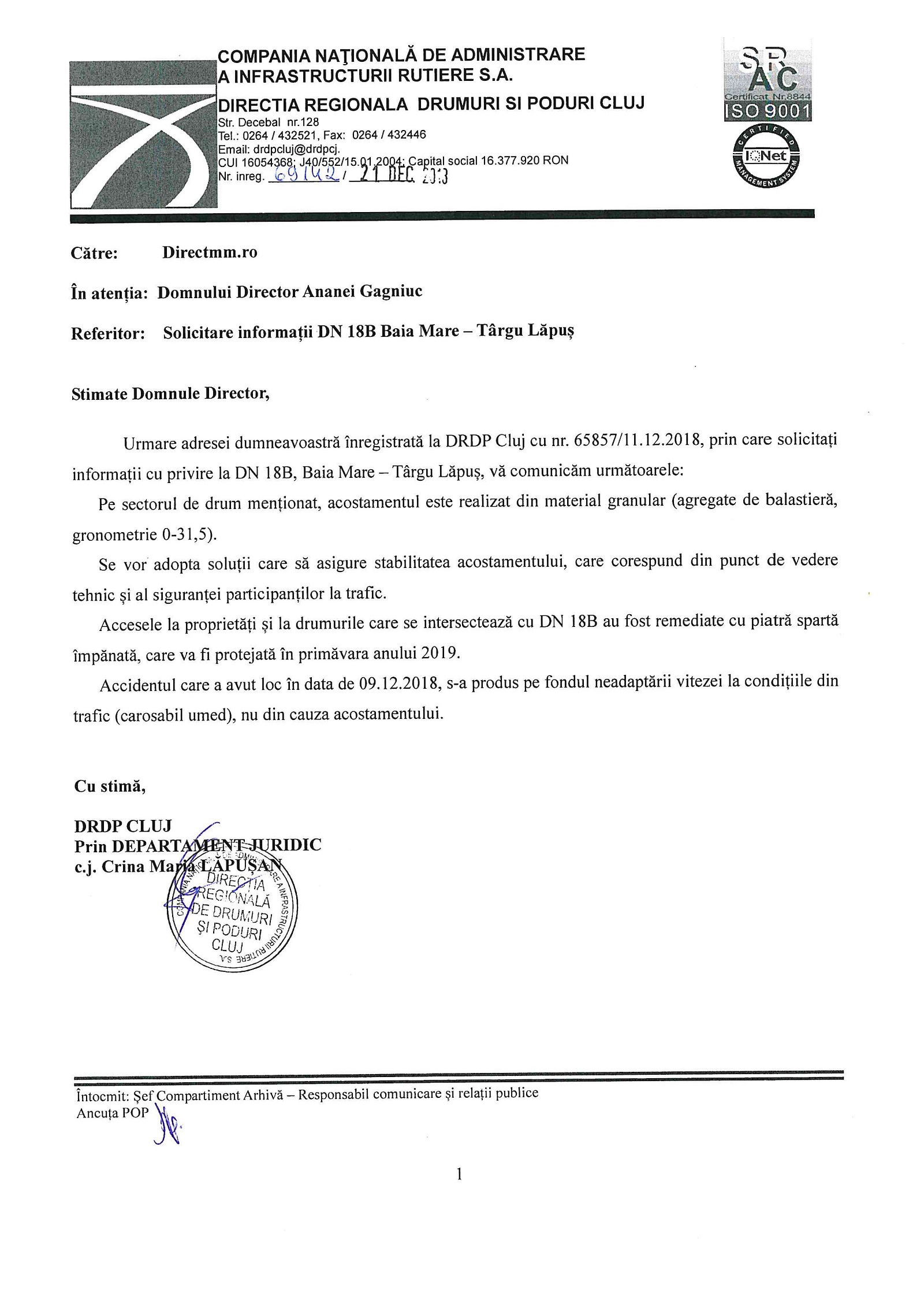 Îmi exprim speranța că gerul va fi un liant stabilizator al acostamentului și că el nu va fi cauza unor accidente înainte de adoptarea acelor soluții nenominalizate, dar izbăvitoare. Pentru a nu fi acuzat de concluzii sau interpretări tendențioase, atașez și răspunsul primit, pentru ca fiecare să ajungă la propria concluzie.