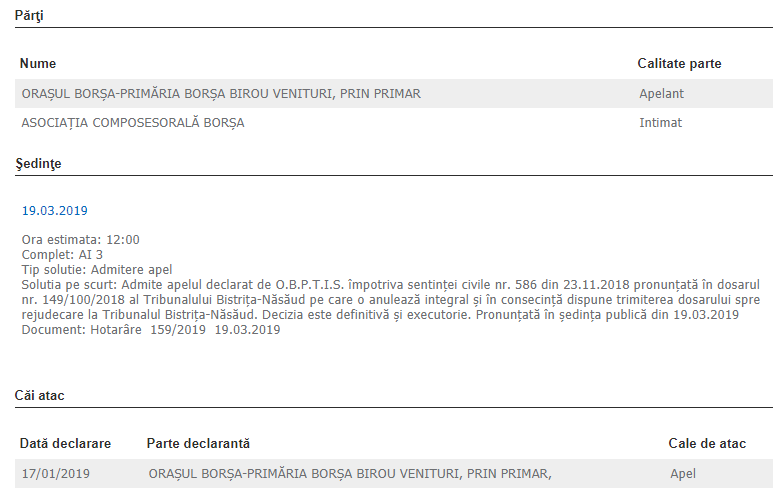 În urma sentinței pronunțate marți, 19 martie, Curtea de Apel Cluj a dat câștig de cauză Primăriei Borșa în procesul cu Asociația Composesorală Borșa, în care aceasta din urmă încerca să scape de niște datorii prin exonerarea de la plata impozitului. În soluția pe scurt, Curtea de Apel Cluj arată că admite apelul declarat de orașul Borșa prin primarul Ion Sorin Timiș împotriva sentinţei civile nr. 586 din 23.11.2018 pronunţată în dosarul nr. 149/100/2018 al Tribunalului Bistriţa-Năsăud, pe care o anulează integral şi în consecinţă dispune trimiterea dosarului spre rejudecare la Tribunalul Bistriţa-Năsăud, decizia fiind definitivă şi executorie.