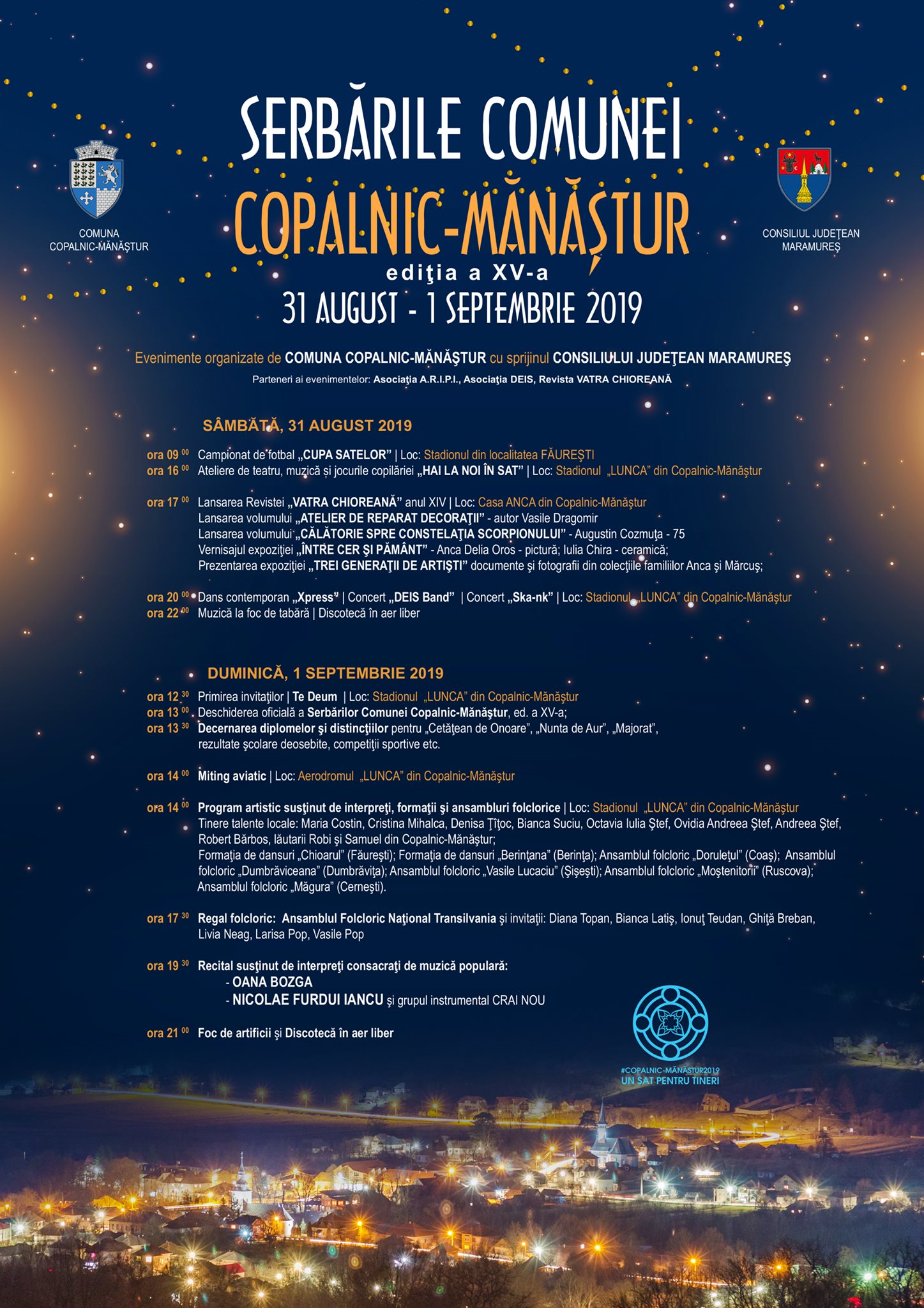 Sâmbătă și duminică, Serbările comunei Copalnic – Mănăștur oferă un program variat, în care spectacolele de muzică populară sau cel aviatic se împletesc armonios cu activitățile culturale pur-sânge: lansări de carte și revistă, expoziții de pictură, ceramică sau de fotografie. La fel cum dansul popular face casă bună cu cel contemporan. Dar iată programul complet al manifestărilor.