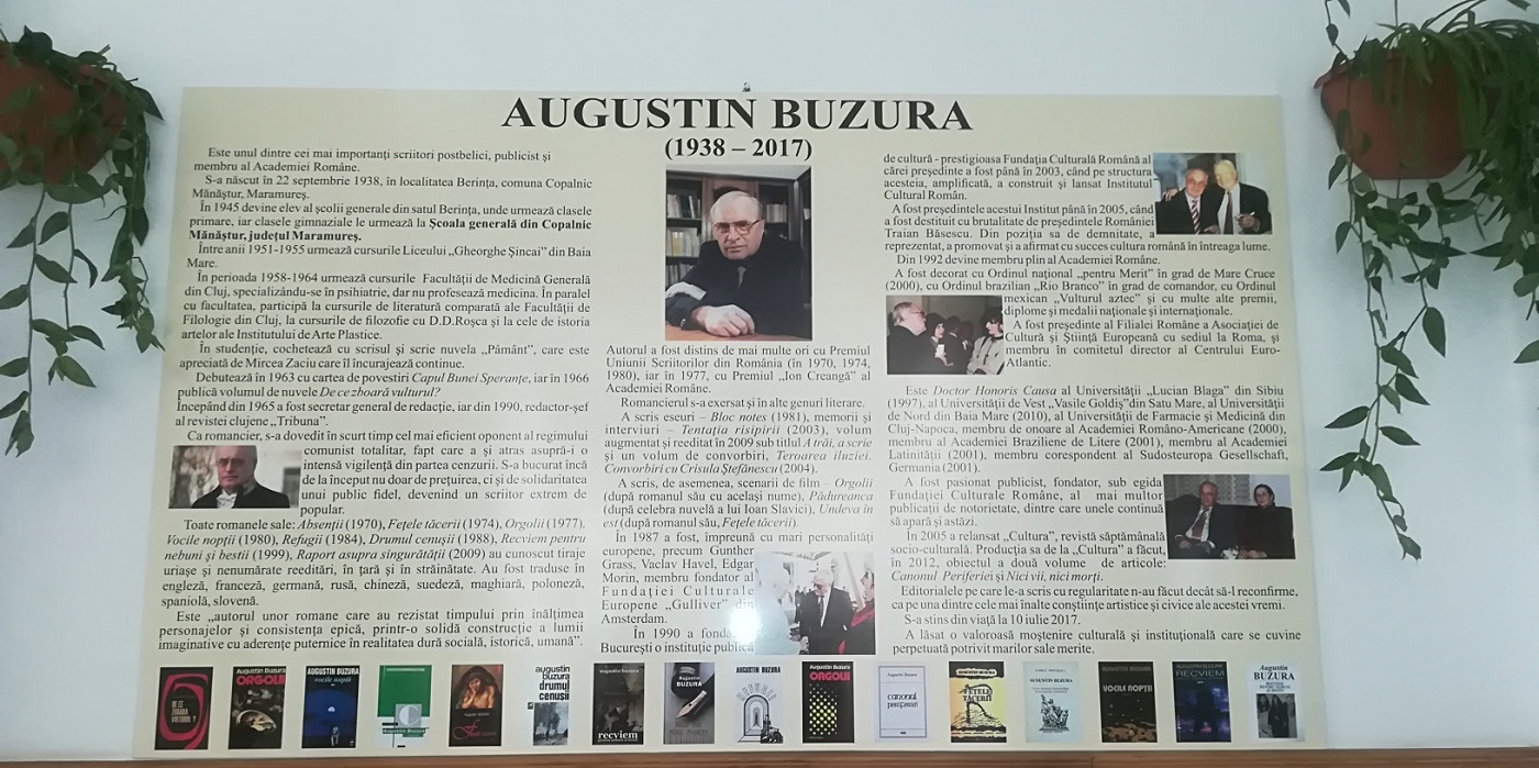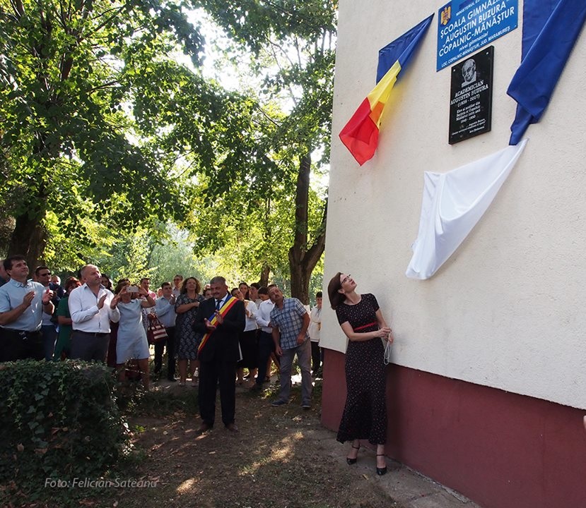 Fiica scriitorului, Anamaria Maior-Buzura, președinta Fundației Culturale Augustin Buzura, a precizat că, la Copalnic-Mănăştur, se petrece primul gest de acest fel în memoria academicianului Augustin Buzura. „Graţie superbului dumneavoastră gest, tata s-a întors acasă. De fapt, s-a întors acolo de unde n-a plecat niciodată. Deşi, viaţa, munca, profesia, scrisul l-au dus prin toată lumea şi l-au stabilit departe de Maramureş, totuşi cu sufletul, cu inima, cu mintea, el n-a plecat, nu s-a desprins niciodată de-aici. Şi nici n-avea cum să plece, pentru că e prea adânc înrădăcinat în aceste locuri, în acest spaţiu. Şi cred că această ne-plecare de acasă, această permanentă legătură cu pământul de-aici a constituit o şansă pentru literatura română. A constituit adevăratul germen al operei lui, fermentul acela din care s-au plămădit personajele romanelor sale. El şi-a populat cărţile cu oamenii acestui spaţiu, cu tot ce au ei uman şi psihologic mai relevant şi multe dintre acţiunile romanelor sale sunt plasate în aceste locuri. Despre Mănăştur şi despre naveta teribilă pe care o făcea pe jos, din Berinţa, peste deal, prin pădure, în ierni cumplite, cu spaime şi lupi, doar pentru a ajunge la şcoală – la această şcoală! – tata a vorbit de nenumărate ori. Au fost eforturi şi experienţe care l-au marcat. Este, parcă, o punte peste timp, care se închide frumos, rotund, azi, aici: dacă el a venit la Copalnic-Mănăştur ca elev, cu drag şi cu seriozitatea-i caracteristică, dumneavoastră îi cinstiţi memoria cu aceeaşi seriozitate şi cu foarte multă eleganţă.” – a precizat Anamaria Maior-Buzura. Felicitând colectivul de dascăli ai şcolii, ambasadorul George Maior, ginerele academicianului Augustin Buzura, a subliniat că acest demers este unul care responsabilizează și obligă la performanță. Vicepreşedintele Consiliului Judeţean Maramureş, Ioan Doru Dăncuş, s-a referit la importanţa cinstirii personalităţilor pe care Maramureşul le are. Cătălin Cherecheş – primarul municipiului Baia Mare – şi-a amintit de felul în care Augustin Buzura era perceput de intelectualitatea băimăreană, înainte de 1989. Un moment impresionant a fost montajul cuprinzând câteva citate din operele şi interviurile lui Augustin Buzura, prezentat de elevii şcolii. La finalul festivităţii, Anamaria Maior-Buzura a dezvelit placa omagială dedicată lui Augustin Buzura.