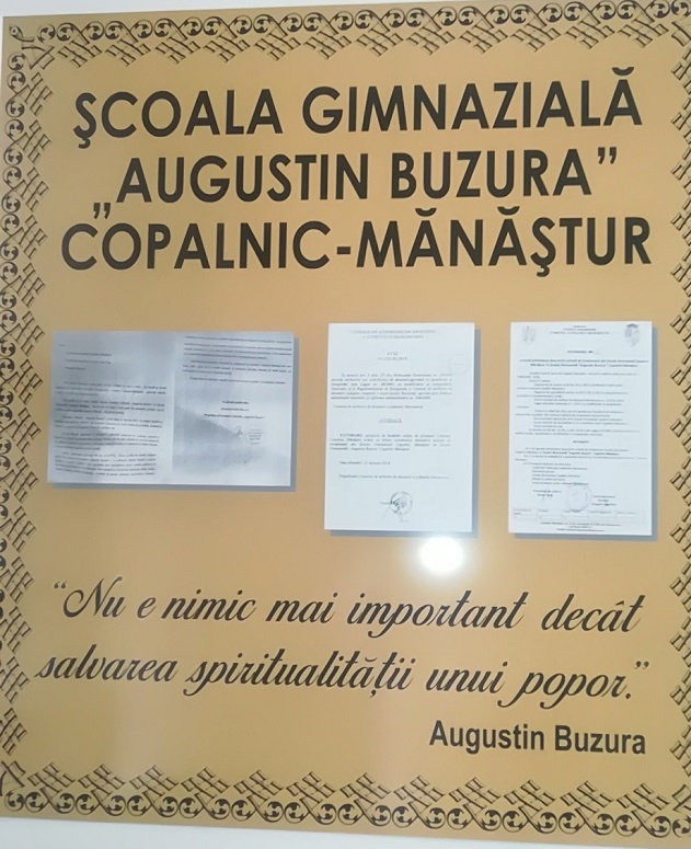 Şcoala Gimnazială Copalnic-Mănăştur a devenit, începând cu 1 septembrie 2018, Şcoala Gimnazială „Augustin Buzura”. În cadrul unei festivităţi emoţionante, la care au participat o mare parte din membrii familiei academicianului Augustin Buzura, şcolii unde acesta a studiat în clasele a V-a şi a VI-a, a i-a fost atribuit numele său. Demersurile pentru ca Augustin Buzura, unul din scriitorii-conştiinţă ai epocii, să devină mentorul spiritual al acestei şcoli au fost demarate de prof. Ioan Pop – directorul şcolii, prof. Emilia Lupşe – director adjunct, împreună cu primarul comunei – Vasile Mihalca, încă în toamna anului trecut, la puţin timp după dispariţia romancierului, născut la 22 septembrie 1938, în Berinţa. În pregătirea acestui eveniment, în holul şcolii s-au plasat două panouri: unul cu documentele care au stat la baza aprobării denumirii şcolii şi altul – despre viaţa şi opera lui Augustin Buzura. „Ne-am dorit şi ne-am promis ca noul an şcolar să ne prindă cu această nouă denumire. Sperăm ca, în curând să putem realiza şi o statuie a academicianului în curtea şcolii” – a precizat directorul coordonator prof. Ioan Pop.