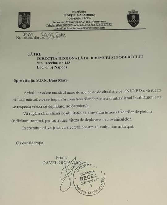 ”Vă rugăm să analizați posibilitatea de a amplasa în zona trecerilor de pietoni rampe/ ridicături pentru a rupe din viteza de deplasare a autoturismelor” – cerea primarul Pavel Octavian.
