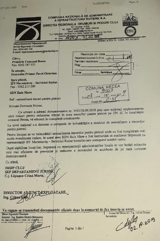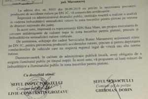 Primul răspuns a venit în 8 octombrie de la DRDP Cluj, în care se propune îmbunătățirea modului de semnalizare a trecerilor pentru pietoni, începând cu cele la care s-au înregistrat mai multe evenimente rutiere. Acestea urmau a fi stabilite de reprezentanții IPJ Maramureș și ai administrației locale și abia apoi ”să se ia măsurile cele mai eficiente de prevenire și reducere a numărului de accidente”.