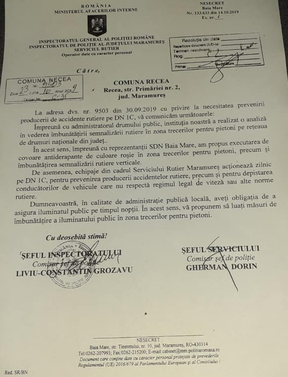 Răspunsul IPJ Maramureș a fost elaborat de în 14 octombrie (și intrat la Primăria Recea în 23.10) și propune o serie de măsuri, convenite împreună cu cei de la SDN Baia Mare: