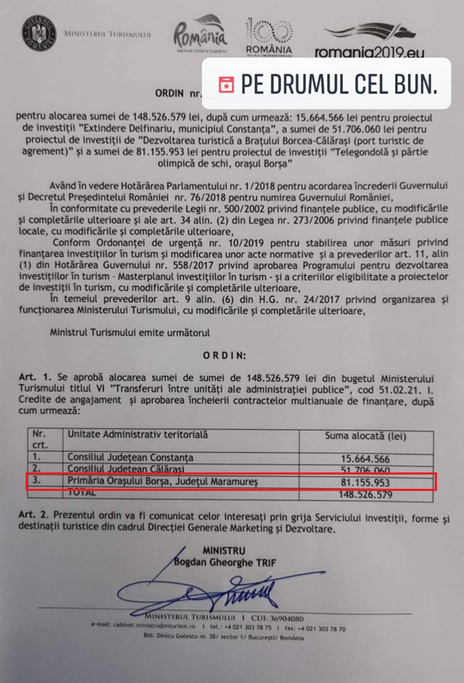 Și prezintă documentul semnat de ministrul Bogdan Gheorghe Trif. E vorba de un ordin prin care se finanțează trei investiții: Delfinariul din Constanța (15.6764.566 lei), Dezvoltarea brațului Borcea-Călărași (51.706,060 lei) și investiția de la Borșa, care primește cea mai mare sumă acordată prin acest ordin (81.155.943 lei) și se aprobă încheierea contractelor multianuale.