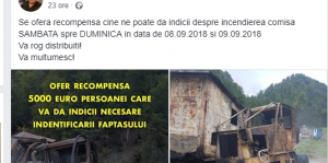 Pentru a impulsiona prinderea făptașilor, proprietarul din Poienile de sub Munte a anunțat că oferă 5000 de euro recompensă persoanei care va da indicii necesare identificării făptașului. Anunțul a fost postat pe facebook (prin nickname-ul Petrecica Junior Petrecica , dându-se și un număr de contact, 0726 337 803), cu rugămintea de a fi distribuit.