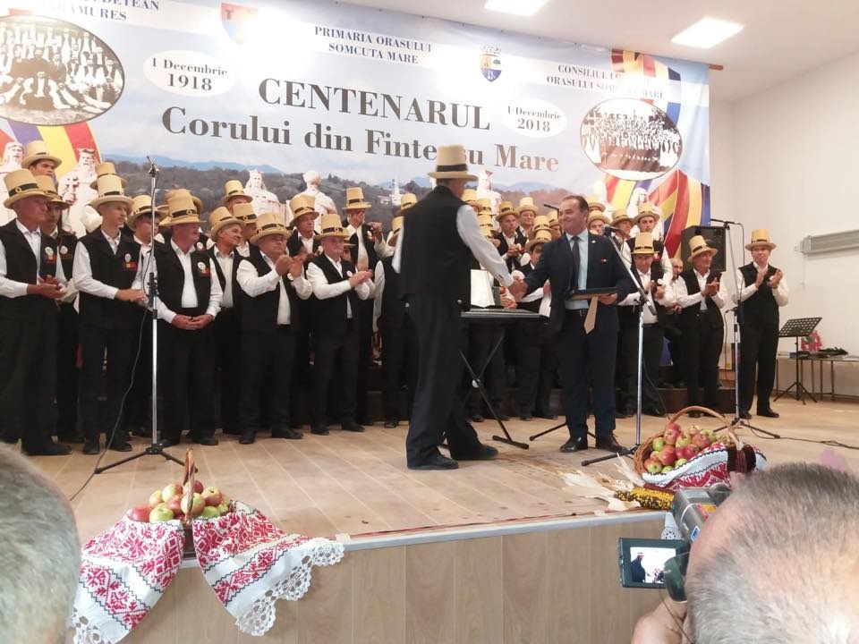 Prima zi a manifestărilor ”O sută de ani de cântec coral la Finteușu Mare” a fost una bogată în activități și participanți. De dimineață, corul sărbătorit a contribuit cu glasurile la Sfânta Liturghie. A fost apoi dezvelit și sfințit Monumentul cântecului coral de la Finteușu Mare. Plăcile de marmură ale acestuia au consemnat pe categorii de voci (bași, baritoni, tenori etc), în ordine alfabetică, pe toți membrii pe care corul i-a avut de-a lungul timpului. Centenarul Corului Bărbătesc din Finteușul Mare nu a trecut neobservat nici la București. Secretarul de stat Alexandru Pugna a înmânat din partea Ministerului Culturii și Identității Naționale câte o Diplomă de excelență corului, dirijorului acestuia, Andrei Dragoș, precum și președintelui Asociației Corale, Valeriu Nistor Dragoș. A fost lansat și volumul „O sută de ani de cântec coral la Finteușu Mare”. O acțiune inedită a constat în plantarea unui tei, care simbolizează prietenia dintre Cornaux (Cantonul Neuchathl, Elvetia) și Finteușu Mare, localități înfrățite încă din 1990. Și, evident, la aniversarea unui cor nu putea lipsi un concert coral, susținut de corurile invitate din Țara Chioarului .