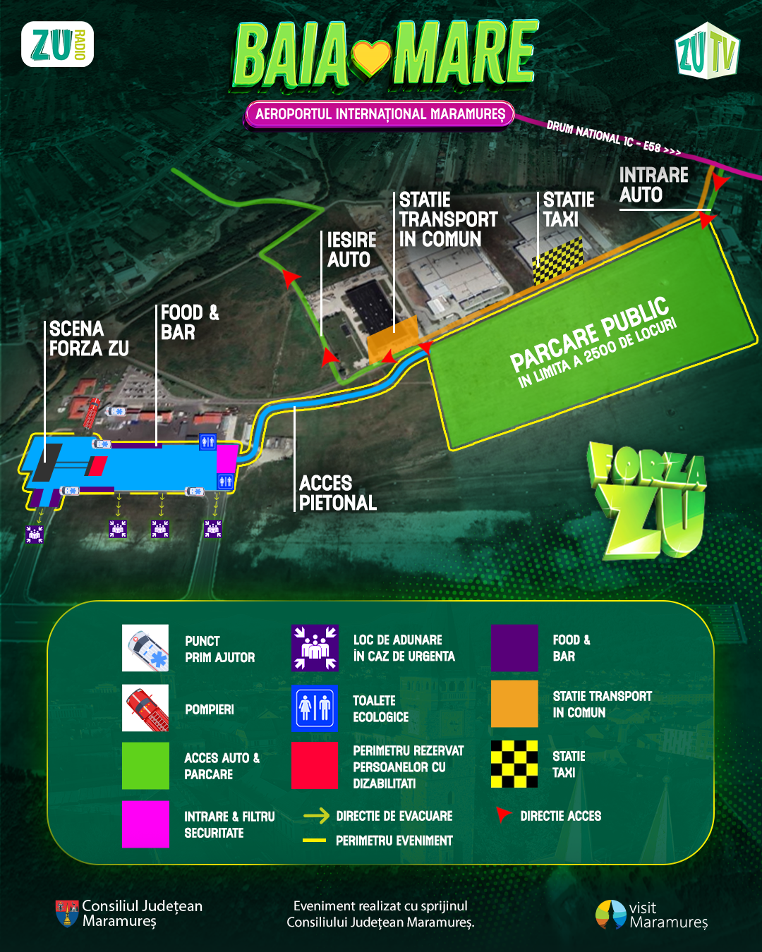 - Pentru participanții la eveniment care vin din Baia Mare există posibilitatea să ajungă în locație fie cu mașinile personale pentru parcarea cărora se va pune la dispoziție o zonă amenajată de parcare gratuit (în limita a 2500 de locuri) în proximitatea Aeroportului Internațional Maramureș (vezi harta pentru a identifica zona parcare pentru public, direcțiile de acces către această zonă, dar și direcțiile de ieșire din această zonă la finalul evenimentului), fie cu mijloacele de transport în comun folosind ruta specială de transport public gratuit prin S.C URBIS S.A. care va circula între Baia Mare și Aeroportul Internațional Maramureș astfel: