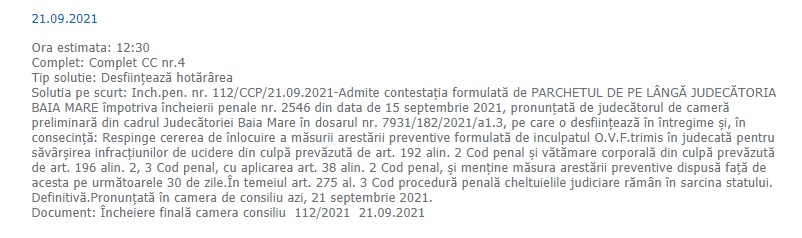 Iată soluția pe scurt! „Inch.pen. nr. 112/CCP/21.09.2021-Admite contestaţia formulată de PARCHETUL DE PE LÂNGĂ JUDECĂTORIA BAIA MARE împotriva încheierii penale nr. 2546 din data de 15 septembrie 2021, pronunţată de judecătorul de cameră preliminară din cadrul Judecătoriei Baia Mare în dosarul nr. 7931/182/2021/a1.3, pe care o desfiinţează în întregime şi, în consecinţă: Respinge cererea de înlocuire a măsurii arestării preventive formulată de inculpatul O.V.F.trimis în judecată pentru săvârşirea infracţiunilor de ucidere din culpă prevăzută de art. 192 alin. 2 Cod penal şi vătămare corporală din culpă prevăzută de art. 196 alin. 2, 3 Cod penal, cu aplicarea art. 38 alin. 2 Cod penal, şi menţine măsura arestării preventive dispusă faţă de acesta pe următoarele 30 de zile.În temeiul art. 275 al. 3 Cod procedură penală cheltuielile judiciare rămân în sarcina statului. Definitivă.Pronunţată în camera de consiliu azi, 21 septembrie 2021”, se arată în soluția pe scurt.