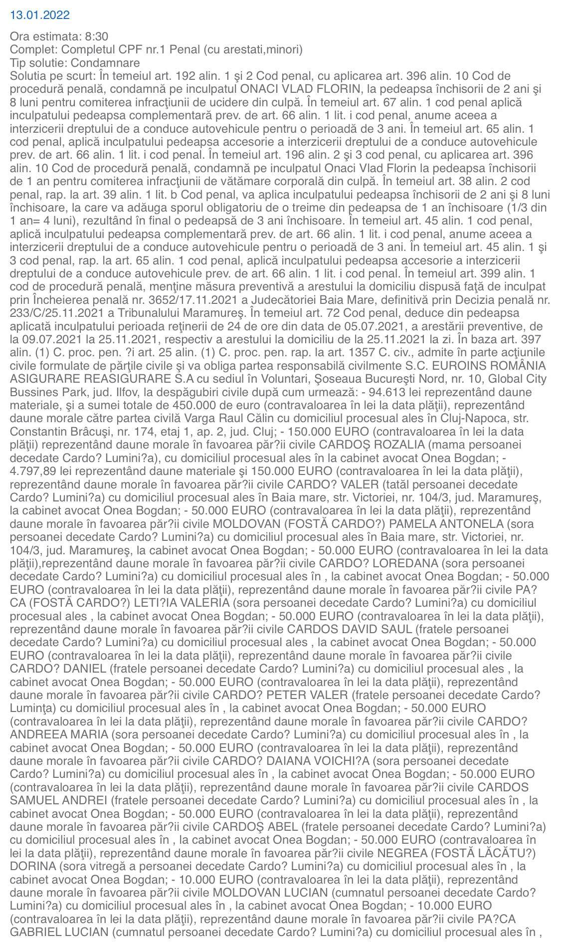 Iată solutia pe scurt! „În temeiul art. 192 alin. 1 şi 2 Cod penal, cu aplicarea art. 396 alin. 10 Cod de procedură penală, condamnă pe inculpatul ONACI VLAD FLORIN, la pedeapsa închisorii de 2 ani şi 8 luni pentru comiterea infracţiunii de ucidere din culpă. În temeiul art. 67 alin. 1 cod penal aplică inculpatului pedeapsa complementară prev. de art. 66 alin. 1 lit. i cod penal, anume aceea a interzicerii dreptului de a conduce autovehicule pentru o perioadă de 3 ani. În temeiul art. 65 alin. 1 cod penal, aplică inculpatului pedeapsa accesorie a interzicerii dreptului de a conduce autovehicule prev. de art. 66 alin. 1 lit. i cod penal. În temeiul art. 196 alin. 2 şi 3 cod penal, cu aplicarea art. 396 alin. 10 Cod de procedură penală, condamnă pe inculpatul Onaci Vlad Florin la pedeapsa închisorii de 1 an pentru comiterea infracţiunii de vătămare corporală din culpă. În temeiul art. 38 alin. 2 cod penal, rap. la art. 39 alin. 1 lit. b Cod penal, va aplica inculpatului pedeapsa închisorii de 2 ani şi 8 luni închisoare, la care va adăuga sporul obligatoriu de o treime din pedeapsa de 1 an închisoare (1/3 din 1 an= 4 luni), rezultând în final o pedeapsă de 3 ani închisoare. În temeiul art. 45 alin. 1 cod penal, aplică inculpatului pedeapsa complementară prev. de art. 66 alin. 1 lit. i cod penal, anume aceea a interzicerii dreptului de a conduce autovehicule pentru o perioadă de 3 ani. În temeiul art. 45 alin. 1 şi 3 cod penal, rap. la art. 65 alin. 1 cod penal, aplică inculpatului pedeapsa accesorie a interzicerii dreptului de a conduce autovehicule prev. de art. 66 alin. 1 lit. i cod penal. În temeiul art. 399 alin. 1 cod de procedură penală, menţine măsura preventivă a arestului la domiciliu dispusă faţă de inculpat prin Încheierea penală nr. 3652/17.11.2021 a Judecătoriei Baia Mare, definitivă prin Decizia penală nr. 233/C/25.11.2021 a Tribunalului Maramureş. În temeiul art. 72 Cod penal, deduce din pedeapsa aplicată inculpatului perioada reţinerii de 24 de ore din data de 05.07.2021, a arestării preventive, de la 09.07.2021 la 25.11.2021, respectiv a arestului la domiciliu de la 25.11.2021 la zi. În baza art. 397 alin. (1) C. proc. pen. ?i art. 25 alin. (1) C. proc. pen. rap. la art. 1357 C. civ., admite în parte acţiunile civile formulate de părţile civile şi va obliga partea responsabilă civilmente S.C. EUROINS ROMÂNIA ASIGURARE REASIGURARE S.A cu sediul în Voluntari, Şoseaua Bucureşti Nord, nr. 10, Global City Bussines Park, jud. Ilfov, la despăgubiri civile după cum urmează: – 94.613 lei reprezentând daune materiale, şi a sumei totale de 450.000 de euro (contravaloarea în lei la data plăţii), reprezentând daune morale către partea civilă Varga Raul Călin cu domiciliul procesual ales în Cluj-Napoca, str. Constantin Brâcuşi, nr. 174, etaj 1, ap. 2, jud. Cluj; – 150.000 EURO (contravaloarea în lei la data plăţii) reprezentând daune morale în favoarea păr?ii civile CARDOŞ ROZALIA (mama persoanei decedate Cardo? Lumini?a), cu domiciliul procesual ales în la cabinet avocat Onea Bogdan; – 4.797,89 lei reprezentând daune materiale şi 150.000 EURO (contravaloarea în lei la data plăţii), reprezentând daune morale în favoarea păr?ii civile CARDO? VALER (tatăl persoanei decedate Cardo? Lumini?a) cu domiciliul procesual ales în Baia mare, str. Victoriei, nr. 104/3, jud. Maramureş, la cabinet avocat Onea Bogdan; – 50.000 EURO (contravaloarea în lei la data plăţii), reprezentând daune morale în favoarea păr?ii civile MOLDOVAN (FOSTĂ CARDO?) PAMELA ANTONELA (sora persoanei decedate Cardo? Lumini?a) cu domiciliul procesual ales în Baia mare, str. Victoriei, nr. 104/3, jud. Maramureş, la cabinet avocat Onea Bogdan; – 50.000 EURO (contravaloarea în lei la data plăţii),reprezentând daune morale în favoarea păr?ii civile CARDO? LOREDANA (sora persoanei decedate Cardo? Lumini?a) cu domiciliul procesual ales în , la cabinet avocat Onea Bogdan; – 50.000 EURO (contravaloarea în lei la data plăţii), reprezentând daune morale în favoarea păr?ii civile PA?CA (FOSTĂ CARDO?) LETI?IA VALERIA (sora persoanei decedate Cardo? Lumini?a) cu domiciliul procesual ales , la cabinet avocat Onea Bogdan; – 50.000 EURO (contravaloarea în lei la data plăţii), reprezentând daune morale în favoarea păr?ii civile CARDOS DAVID SAUL (fratele persoanei decedate Cardo? Lumini?a) cu domiciliul procesual ales , la cabinet avocat Onea Bogdan; – 50.000 EURO (contravaloarea în lei la data plăţii), reprezentând daune morale în favoarea păr?ii civile CARDO? DANIEL (fratele persoanei decedate Cardo? Lumini?a) cu domiciliul procesual ales , la cabinet avocat Onea Bogdan; – 50.000 EURO (contravaloarea în lei la data plăţii), reprezentând daune morale în favoarea păr?ii civile CARDO? PETER VALER (fratele persoanei decedate Cardo? Luminţa) cu domiciliul procesual ales în , la cabinet avocat Onea Bogdan; – 50.000 EURO (contravaloarea în lei la data plăţii), reprezentând daune morale în favoarea păr?ii civile CARDO? ANDREEA MARIA (sora persoanei decedate Cardo? Lumini?a) cu domiciliul procesual ales în , la cabinet avocat Onea Bogdan; – 50.000 EURO (contravaloarea în lei la data plăţii), reprezentând daune morale în favoarea păr?ii civile CARDO? DAIANA VOICHI?A (sora persoanei decedate Cardo? Lumini?a) cu domiciliul procesual ales în , la cabinet avocat Onea Bogdan; – 50.000 EURO (contravaloarea în lei la data plăţii), reprezentând daune morale în favoarea păr?ii civile CARDOS SAMUEL ANDREI (fratele persoanei decedate Cardo? Lumini?a) cu domiciliul procesual ales în , la cabinet avocat Onea Bogdan; – 50.000 EURO (contravaloarea în lei la data plăţii), reprezentând daune morale în favoarea păr?ii civile CARDOŞ ABEL (fratele persoanei decedate Cardo? Lumini?a) cu domiciliul procesual ales în , la cabinet avocat Onea Bogdan; – 50.000 EURO (con