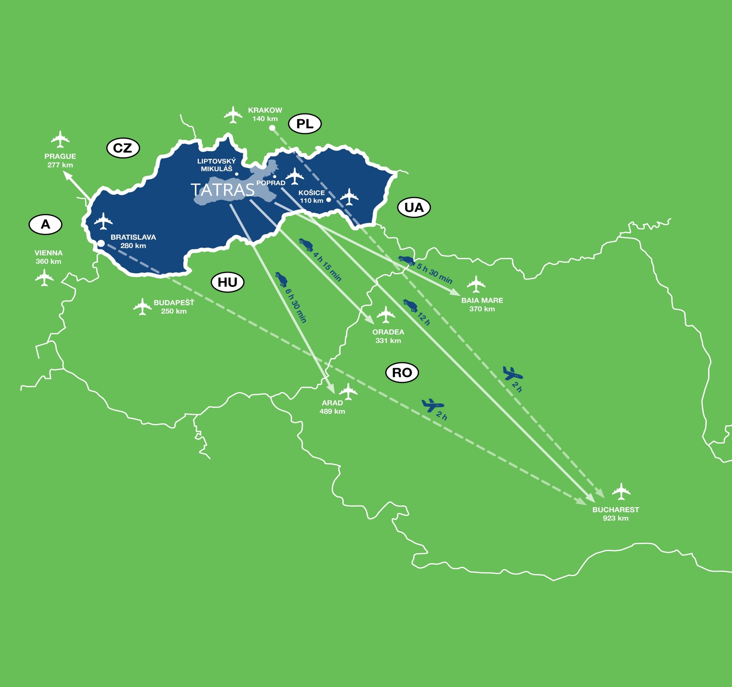 Zboruri din București spre Cracovia (la 2 ore de Poprad). Trenuri alpine pitorești leagă orașe precum Štrbské Pleso, Starý Smokovec și Tatranská Lomnica—puncte de pornire ideale pentru trasee.