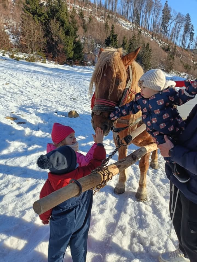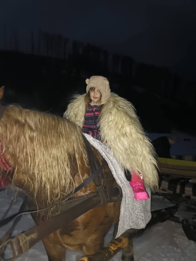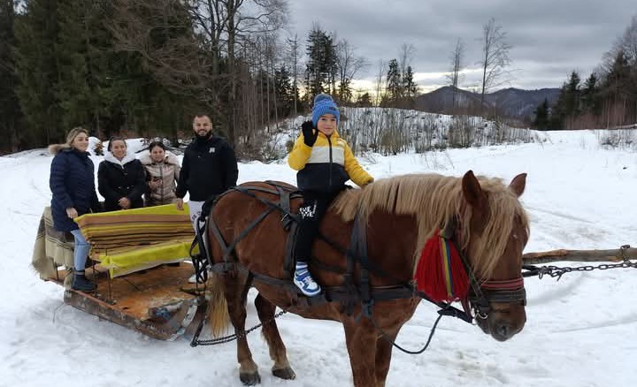 Turiști fericiți după o plimbare cu sania, trasă de iapa Karina