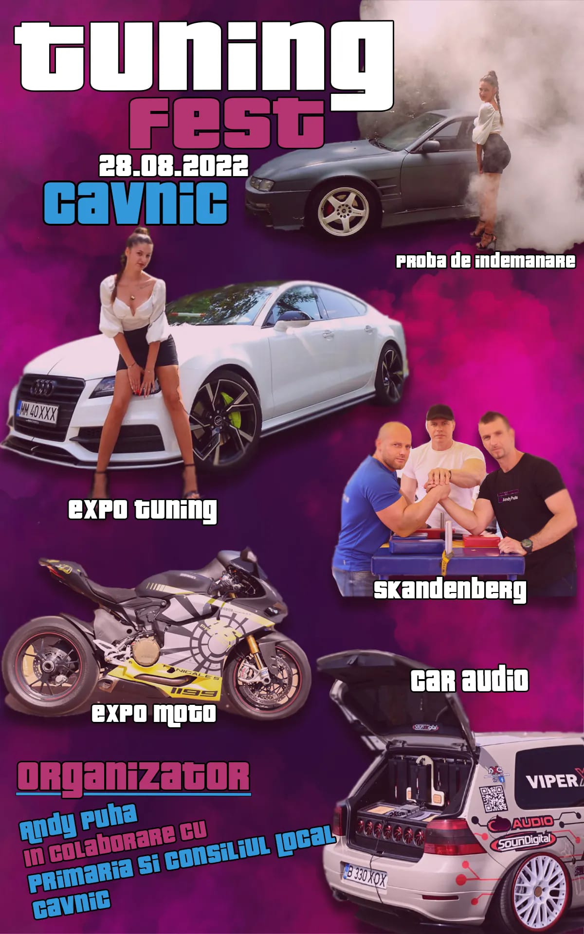 „Duminică, 28 august 2022, vă așteptăm la Tuning Fest 2022 Cavnic! Vreau să mulțumesc încă de acum lui Marius Gabriel Rednic, Andrei Nechifor, Norbert Ceterci, pentru că sunt în echipa mea foarte importanți! Vor mai veni să cante la eveniment Xenia Costinar, Maria Antonia Criste, Alexandra Achim, Andreea, ne va încânta cu un super număr de fachirism Ianis & Anda și vor fi multe alte concursuri! Vor încinge atmosfera fetele de la Dream Hostess, restul surprizelor le găsiți la Cavnic! La ora 09:00 începe evenimentul cu parcarea mașinilor și motocicletelor și încep inscrierile pentru skandenberg alături de campionii noștri!”, arată Andy Puha.