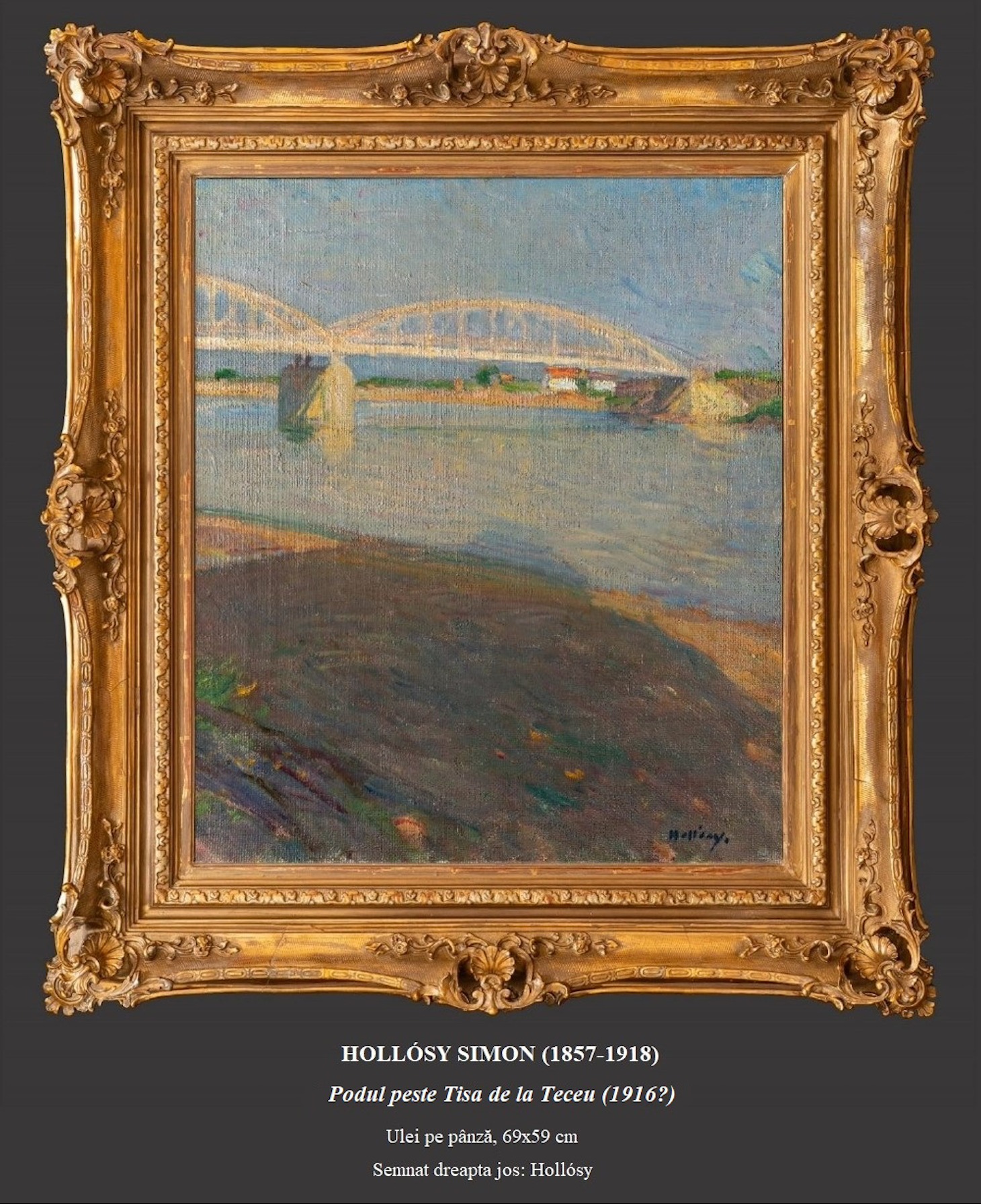 În al doilea rând, lucrarea de față are o valoare istorică semnificativă deoarece ilustrează podul de oțel de peste Tisa, construit în anul 1905 și aruncat în aer de către trupele germane în octombrie 1944. Pentru acea perioadă, în care majoritatea podurilor erau realizate din lemn, construcția unui pod din oțel poate fi considerată ca fiind o performanță remarcabilă, cu atât mai mult cu cât la nivel european existau un număr redus de poduri similare în zone rurale. Așadar, este demn de remarcat faptul că județul nostru, prin podul de la Teceu, a fost puternic ancorat la progresele realizate pe plan european, iar lucrarea lui Hollósy reprezintă una din mărturiile istorice pe care le avem în acest sens. Peisajul, de dimensiuni medii (69×59 cm), a fost realizat cu doar doi ani înainte ca artistul să se stingă din viață și prezintă în culori pastelate cadrul natural al râului Tisa, într-o zi senină, luminoasă și toridă de vară. Partea inferioară a lucrării ilustrează malul umbrit și nisipos al Tisei. Printr-un joc de măiestrie cromatică, dezlănțuit cu tușe energice care cuprind întreaga paletă a curcubeului, de la nuanțe de violet, trecând prin albastru, verde și griuri colorate, până la nuanțe de roșu, Hollósy oferă o lecție de armonizare și interpretare a nuanțelor cromatice. În partea centrală este redat cursul albastru-cenușiu al râului, presărat cu reflexele galbene ale razelor de soare. Între culoarea apei și cea a cerului nu există un contrast foarte puternic, însă cele două planuri sunt separate de linia orizontului și de podul alb-gălbui care se arcuiește peste apă. Mica fermă reprezentată în plan secundar are rolul de a completa imaginea simplă, însă în același timp frumoasă a vieții de la țară. „Întreaga imagine este acoperită de un lac gălbui, tern al razelor solare” (Németh, 1956, p. 117) și oferă privitorului o perspectivă asupra stării sufletești în care se afla artistul la final de viață și de carieră (Réti, 2011, pp. 76-77), dar totodată și asupra impactului pozitiv pe care anii petrecuți la Teceu l-au avut asupra dezvoltării concepțiilor sale. După cum el însuși mărturisește într-o scrisoare adresată unui prieten, „nu trebuie pictat cu pensula, ci cu sufletul” (Szöllősy, 2003). Așadar, se poate afirma că anii petrecuți la Teceu l-au ajutat pe Hollósy să atingă apogeul creației sale din punct de vedere cromatic, în pictura de peisaj. În concluzie, prin opera și viața sa, Hollósy evidențiază foarte clar faptul că arta nu cunoaște granițe. Ce l-a determinat pe artist să picteze podul de la Teceu? Probabil că pe lângă însemnătatea acestuia în reflectarea progresului tehnic și industrial al societății, alți posibili factori care au stat la baza deciziei sale de a realiza această lucrare au fost dorința de a marca în plan pictural și simbolic interconexiunea prin care se caracterizează comunitățile umane, precum și de a transpune pe pânză faptul că el însuși a fost un nucleu și promotor al cooperării inter-etnice (prin implicarea activă în formarea unor elevi din întreaga lume și prin activitățile educațional-artistice pe care le-a desfășurat atât la München, cât și în județul Maramureș). Totodată, este foarte posibil ca în mod inconștient „maestrul” să fi fost atras de motivul „podului” tocmai datorită spiritului său pedagogic deosebit și dorinței de a ilustra necesitatea de a contribui la crearea unei „punți între generații”, prin transmiterea cunoașterii sale către tinerii artiști. Nu în ultimul rând, dacă ținem cont de momentul în care a fost realizată lucrarea, respectiv în timpul Primului Război Mondial, se poate interpreta că prin aceasta artistul a dorit să transmită un mesaj de pace (prin culoarea albă a podului), de reluare a bunelor colaborări dintre state și de găsire a unor soluții pentru transformarea barierelor fizice reprezentate de granițe, dintr-un motiv de dispută, într-o oportunitate de realizare a unor schimburi reciproc avantajoase de idei, cunoștințe, valori, idealuri și, de ce nu, de bune-practici care să contribuie la dezvoltarea comunităților”, arată specialiștii pe blogul muzeului.