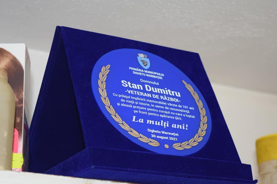În semn de aleasă prețuire și recunoaștere a faptelor de vitejie și a curajului de care a dat dovadă, i-am înmânat în numele administrației locale și a comunității sighetene o plachetă aniversară și un tort aniversar. Cu simplitatea care-l caracterizează, a apreciat mult gestul, care desigur este doar un mic simbol prin care am încercat să ne arătăm recunoștința față de unul dintre cei mai de seamă sigheteni. Darul care l-a emoționat până la lacrimi însă, a fost drapelul tricolor, pentru care și alături de care a luptat pe front și a înfruntat vitregiile acelor vremuri. Vă mulțumim pentru dragostea de neam și țară de care ați dat dovadă, dar și pentru sacrificiul și dăruirea cu care ați luptat pe front pentru ca noi să ne putem bucura astăzi de o țară liberă și întregită. Sănătate și mulți ani, domnule Sublocotenent în retragere – veteran de război, Stan Dumitru!”, arată Vasile Moldovan, primarul municipiului Sighetu Marmației.