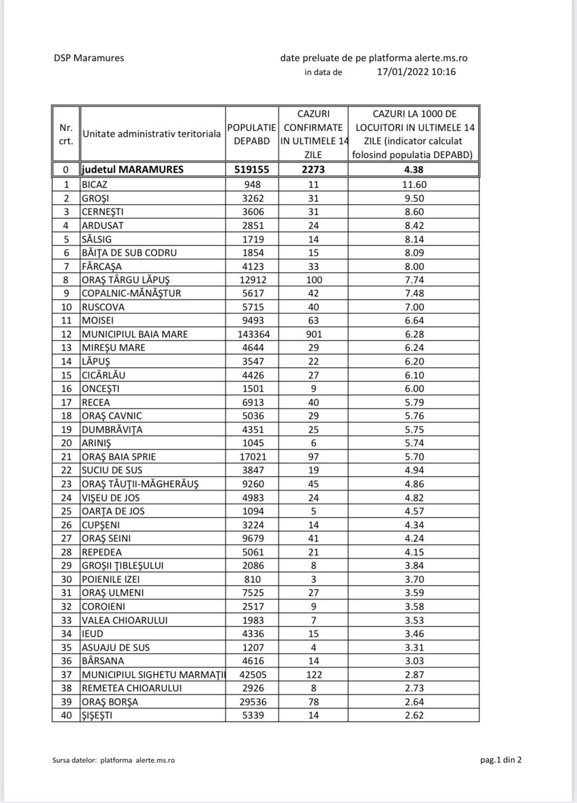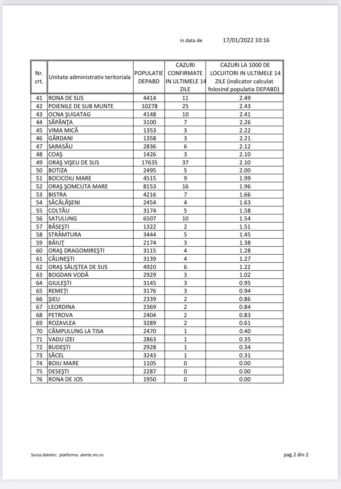 Conform datelor actualizate cu privire la rata incidență cumulată în ultimele 14 zile, în județ sunt 36 de unități administrativ-teritoriale care au înregistrată o valoare de peste 3 cazuri la 1000 de locuitori (Bârsana 3,03; Asuaju de Sus 3,31; Ieud 3,46; Valea Chioarului 3,53; Coroieni 3,58; Ulmeni 3,59; Poienile Izei 3,70; Groșii Țibleșului 3,84; Repedea 4,15; Seini 4,24; Cupșeni 4,34; Oarța de Jos 4,57; Vișeu de Jos 4,82; Tăuții Măgherăuș 4,86; Suciu de Sus 4,94; Baia Sprie 5,70; Ariniș 5,74; Dumbrăvița 5,75; Cavnic 5,76; Recea 5,79; Oncești 6; Cicârlău 6.10; Lăpuș 6.20; Mireșu Mare 6,24; Baia Mare 6,28; Moisei 6,64, Ruscova 7; Copalnic Mănăștur 7,48; Târgu Lăpuș 7,74; Fărcașa 8; Băița de Sub Codru 8,09; Sălsig 8,14; Ardusat 8,42; Cernești 8,60; Groși 9,50 și Bicaz 11,60). De asemenea, rata de incidență cumulată în ultimele 14 zile la nivelul județului Maramureș are valoarea de 4,38 cazuri la 1000 de locuitori. În acest context, conform specialiștilor în sănătate publică vaccinarea rămâne cea mai la îndemână soluție de protecție împotriva pandemiei COVID-19. Vaccinurile împreună cu respectarea măsurilor de protecție constituie principalele căi de a limita efectele pandemiei!