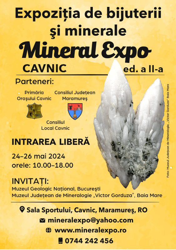 Mineral Expo – Cavnic 2024 continuă să promoveaze știința geologiei, patrimoniul cultural al României, precum și istoria orașului Cavnic, recunoscut pentru fostele mine de aur și argint sau prelucrarea metalelor, reunind la Sala Sportului, în perioada 24-26 mai 2024, un număr impresionant de expozanți, geologi, gemologi, mineri, mineralogi, pasionați de cristale și minerale.