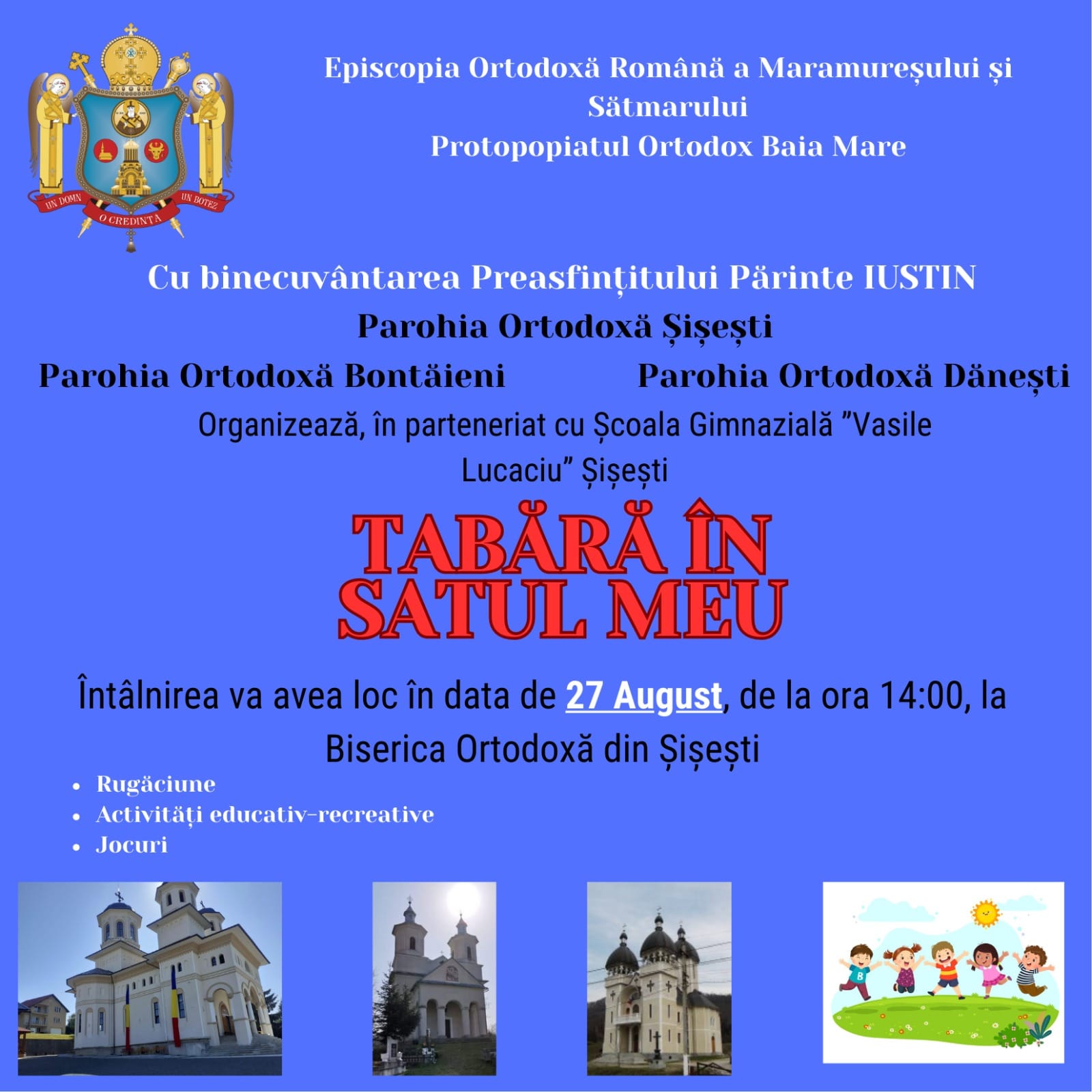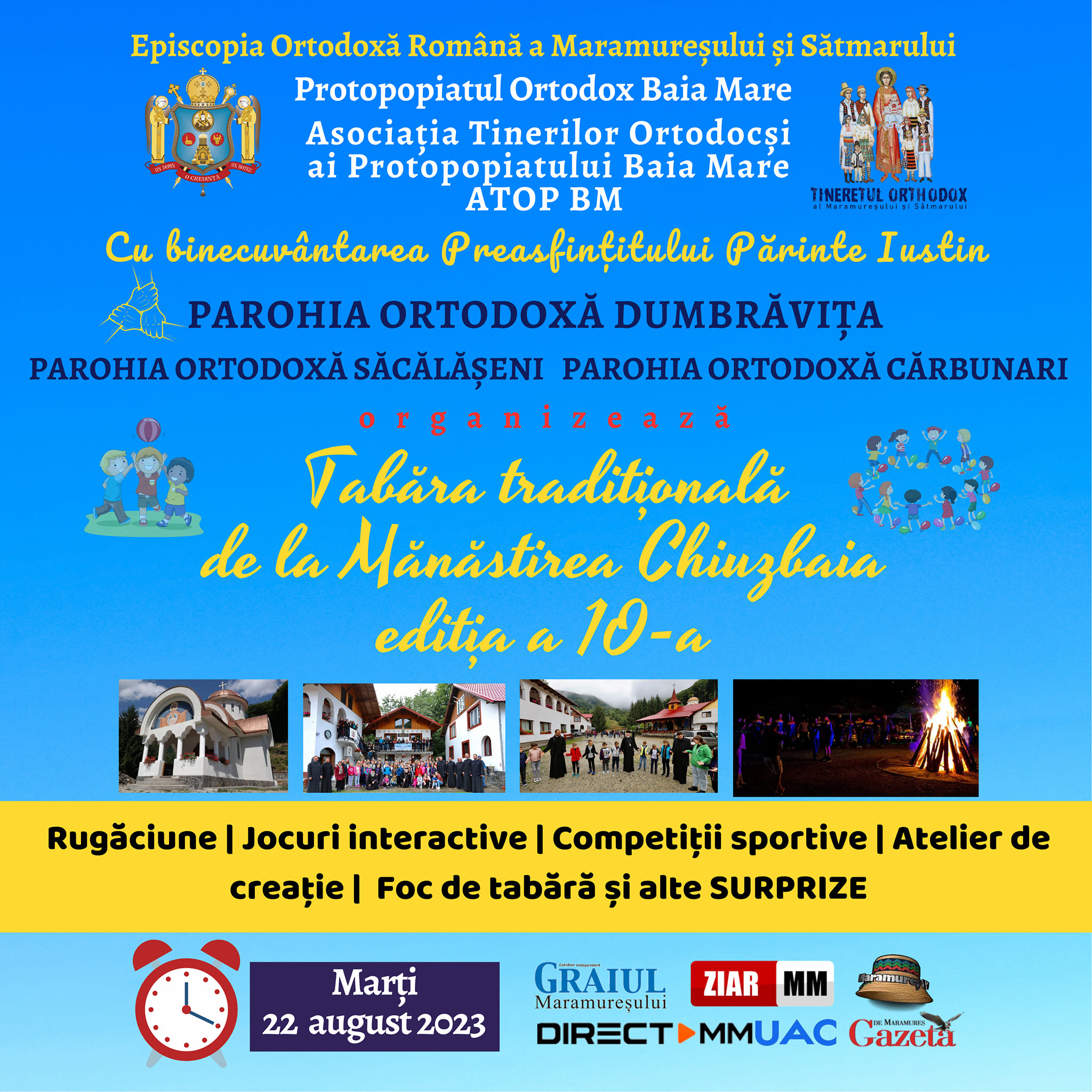Ei bine pentru că vara încă este în desfășurare, iar vacanța la fel, continuă activitățile de acest gen. Parohia Ortodoxă Dumbrăvița, Parohia Ortodoxă Săcălășeni și Parohia Ortodoxă Cărbunari, organizează cea de-a X-a ediție a taberei tradiționale de la Mănăstirea Chiuzbaia. Tabăra va avea loc marți în data de 22 august 2023, unde se vor desfășura mai multe activități interactive, precum: competiții sportive, rugăciuni, jocuri, atelier de creație, foc de tabără și alte surprize. Totodată, în 27 august 2023, începând cu ora 14.00, Parohia Ortodoxă Șișești, Parohia Ortodoxă Bontăieni si Parohia Ortodoxă Dănești, organizează, în parteneriat cu Școala Gimnazială „Vasile Lucaciu” Șișești, „Tabără în satul meu”. Vor avea loc momente de rugăciune, joacă și activități educativ-recreative.