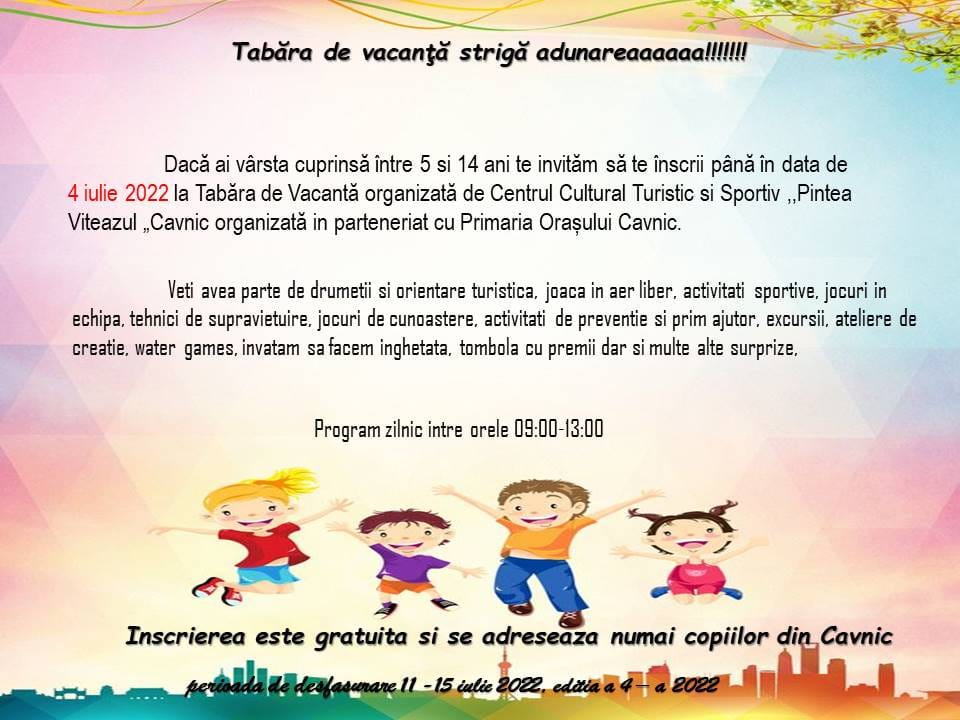 „Dacă ai vârsta cuprinsă între 5 și 14 ani, te invităm să te înscrii până în data de 4 iulie, la Tabăra de Vacanță organizată de Centrul Cultural Sportiv și Turistic Pintea Viteazul din Cavnic, organizată în parteneriat cu Primăria Cavnic.