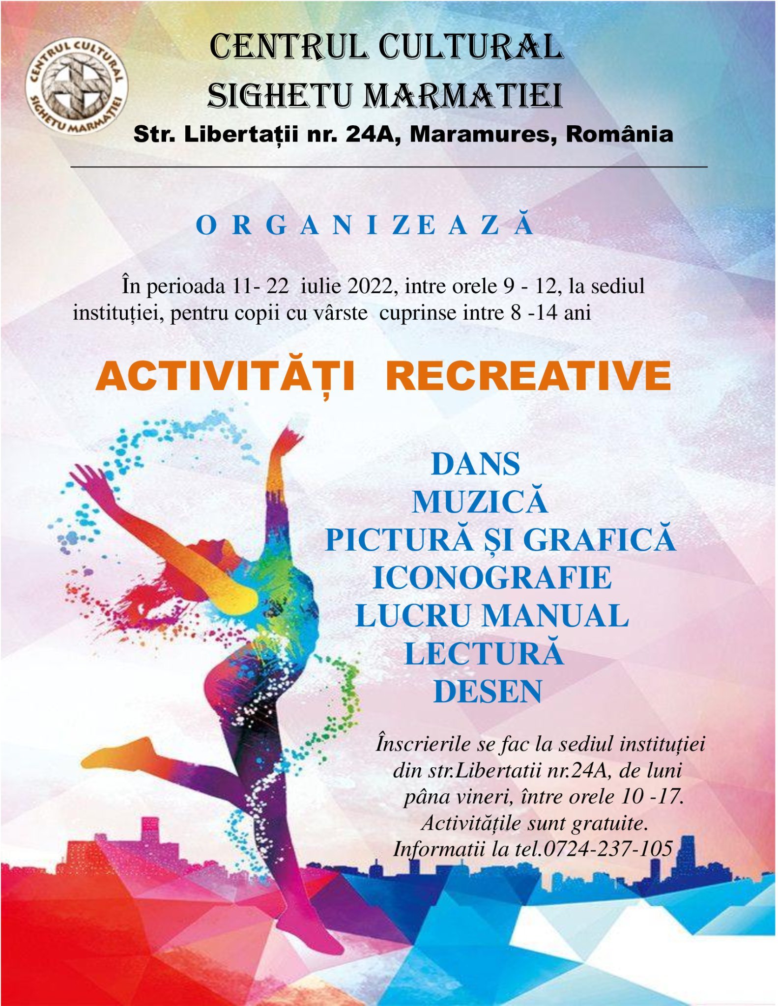 Centrul Cultural al Municipiului Sighetu Marmației organizează în perioada 11 – 22 iulie 2022 o tabără de vară pentru copiii cu vârste cuprinse între 8 și 14 ani.
