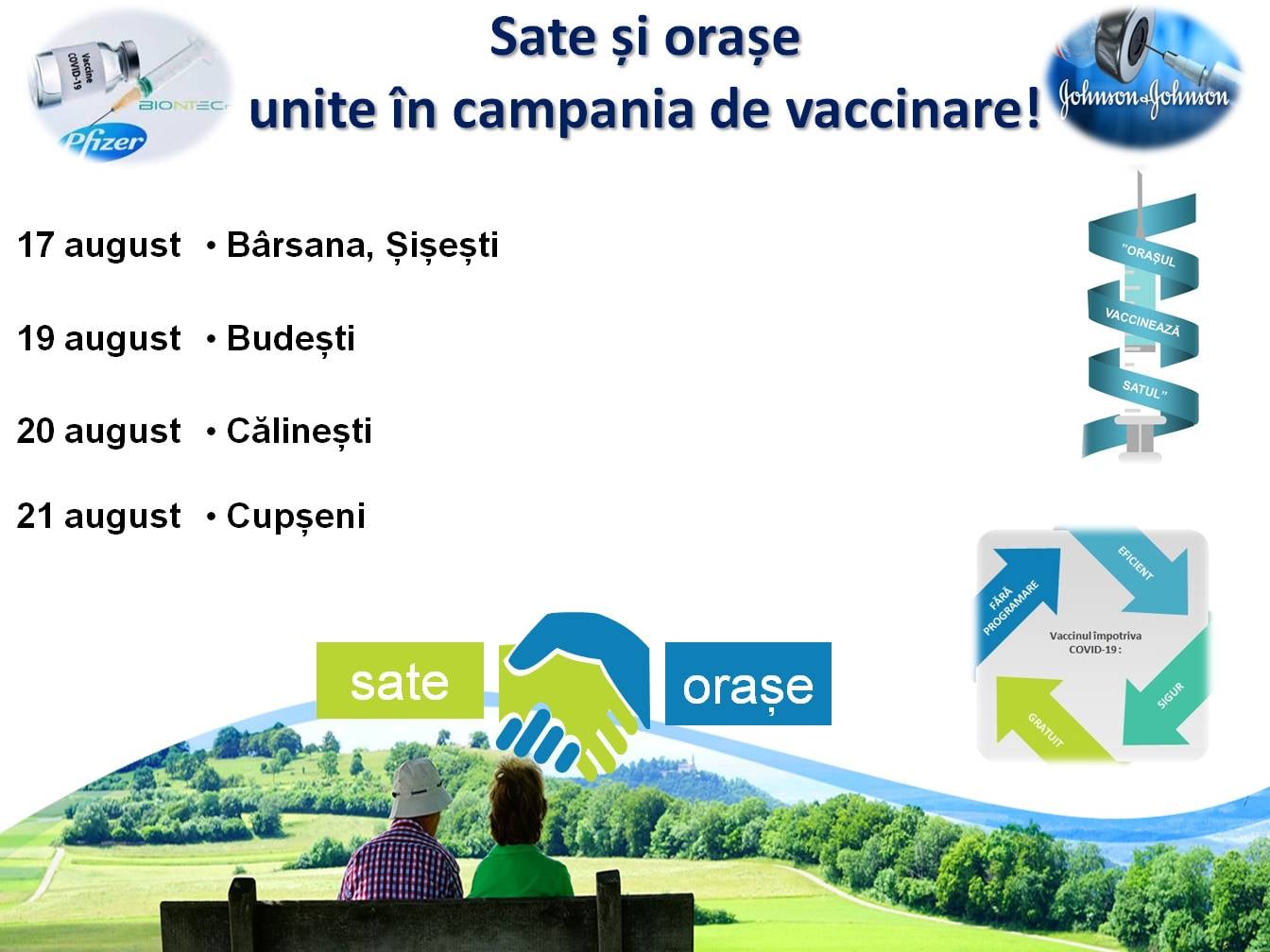 Campania ”Orașul vaccinează Satul” este derulată în teritoriu de Instituția Prefectului – Județul Maramureș, Direcția de Sănătate Publică Maramureș, autoritățile administrației publice locale și echipele mobile din centrele de vaccinare de la nivelul județului, alcătuite din medici, asistenți medicali și registratori. Iată programul acestei săptămâni!