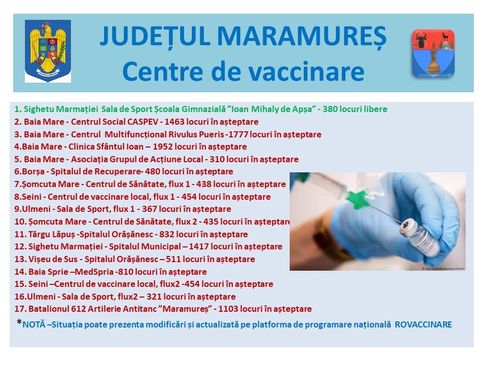 Luni, 22 martie, la orele după-amiezii, locuri libere mai erau numai în Sighetu Marmației. La centrul respectiv se administrează serul produs de Astra Zeneca.