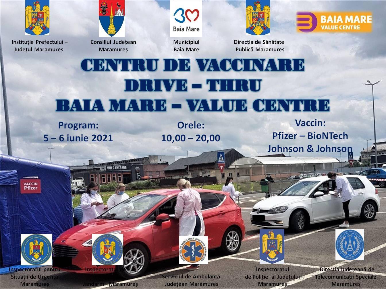 BAIA MARE. Instituția Prefectului-Județul Maramureș, Consiliul Județean Maramureș, Municipiul Baia Mare, Direcția de Sănătate Publică Maramureș, Baia Mare Value Centre, Inspectoratul pentru Situații de Urgență ”Gheorghe Pop de Băsești” al Județului Maramureș, Inspectoratul de Poliție al Județului Maramureș, Inspectoratul de Jandarmi Județean ”Pintea Viteazul” Maramureș, Serviciul de Ambulanță Județean Maramureș și Direcția Județeană de Telecomunicații Speciale Maramureș organizează, în perioada 5 -6 iunie 2021, campania de vaccinare drive thru Baia Mare Value Centre, în parcarea centrului comercial Baia Mare Value Centre.