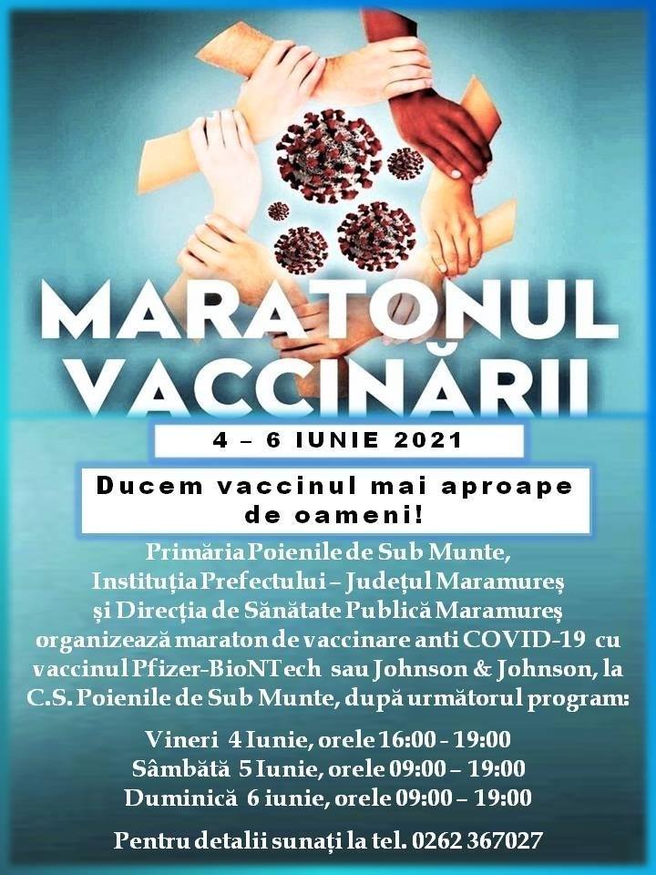 POIENILE DE SUB MUNTE. Primăria Poienile de Sub Munte, Instituția Prefectului-Județul Maramureș și Direcția de Sănătate Publică Maramureș organizează în perioada 4-6 iunie a.c., la Centrul de Vaccinare din comuna Poienile de Sub Munte, Maratonul Vaccinării ”Ducem mai aproape vaccinul de oameni!”