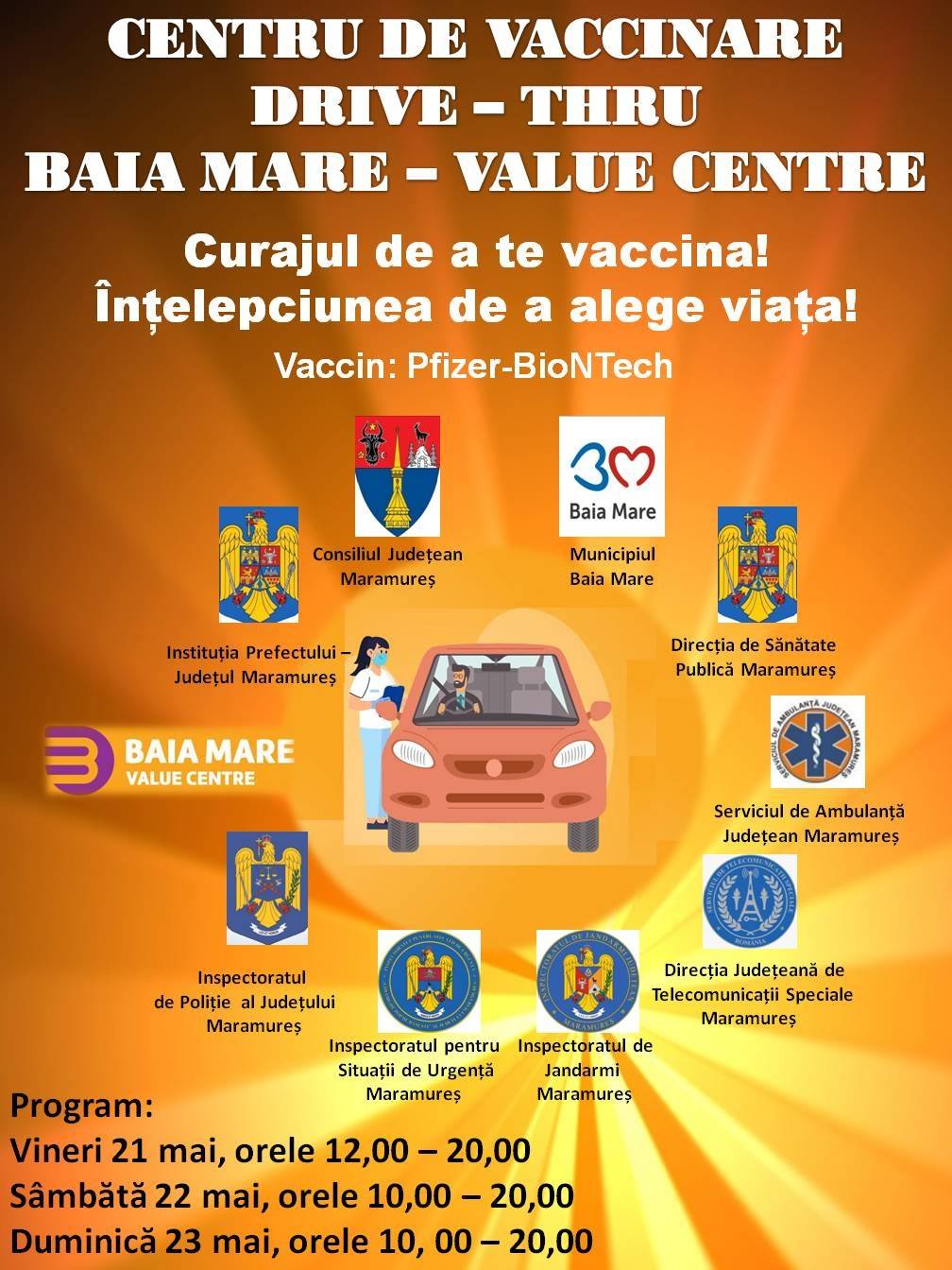Instituția Prefectului-Județul Maramureș, Consiliul Județean Maramureș, Municipiul Baia Mare, Direcția de Sănătate Publică Maramureș, Baia Mare Value Centre, Inspectoratul pentru Situații de Urgență ”Gheorghe Pop de Băsești” al Județului Maramureș, Inspectoratul de Poliție al Județului Maramureș, Inspectoratul de Jandarmi Județean ”Pintea Viteazul” Maramureș, Serviciul de Ambulanță Județean Maramureș și Direcția Județeană de Telecomunicații Speciale Maramureș organizează, în parcarea centrului comercial Value Centre, în perioada 21 – 23 mai 2021, campania de vaccinare DRIVE-THRU Baia Mare Value Centre. Persoanele care doresc să se vaccineze se pot prezenta, indiferent de localitatea de domiciliu în parcarea centrului comercial, fără programare, prezentând documente de identitate valabile (carte de identitate sau pașaport).