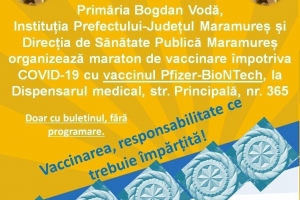 Primăria Bogdan Vodă, Instituția Prefectului-Județul Maramureș și Direcția de Sănătate Publică Maramureș organizează în perioada 21-23 mai a.c., la Dispensarul medical din comuna Bogdan Vodă, Maratonul ”Vaccinarea, responsabilitate ce trebuie împărțită!”