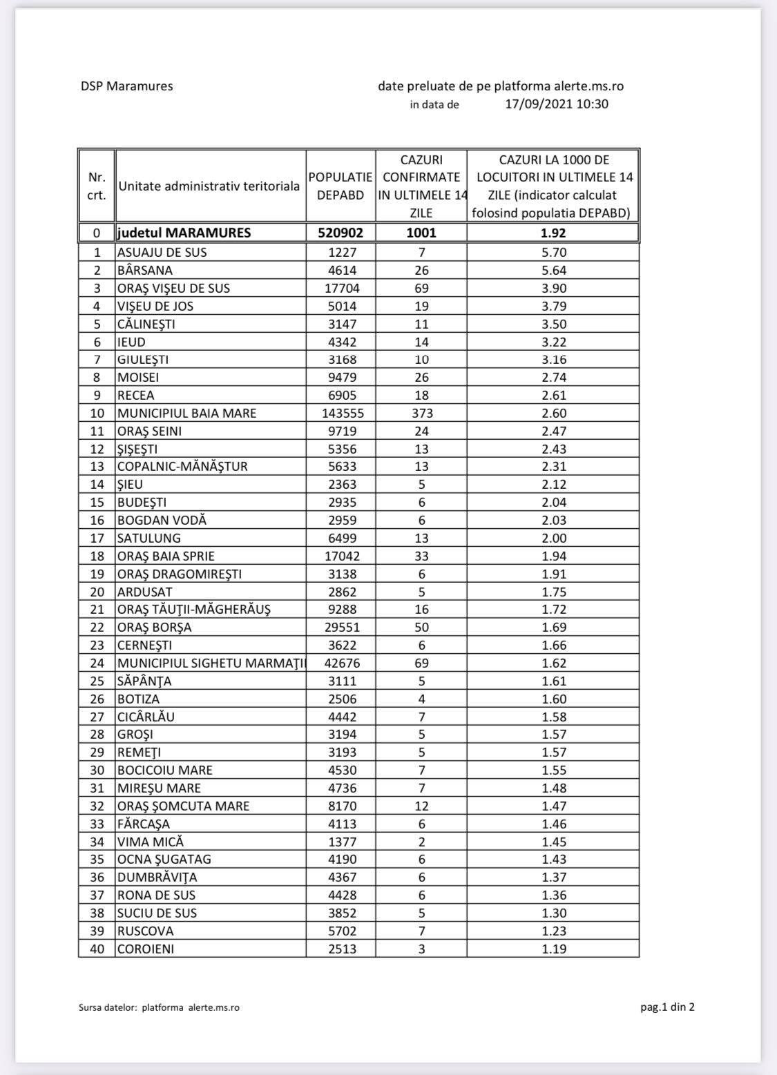 Cu toate acestea reședința de județ are o incidență mult mai mică raportată la mia de locuitori față de celelalte unități administrativ-teritoriale (UAT) care au înregistrat cazuri în aceste două săptămâni. În Maramureș s-au confirmat cazuri în 65 UAT-uri, și aici existând o creștere considerabilă, iar municipiul Baia Mare se află pe locul 10. Pe primele cinci locuri în topul incidenței se află patru comune și un oraș, respectiv Asuaju de Sus, Bârsana, Vișeu de Sus, Vișeu de Jos, Călinești. Avem în 17 septembrie 13 UAT-uri în două seturi, unde sunt instituite măsuri suplimentare de protecție iar aici ne referim la Vișeu de Jos, Vișeu de Sus, Asuaju de Sus, Ieud, Giulești și Bârsana, respectiv Baia Mare, Seini, Șișești, Călinești, Satulung, Moisei și Recea. La cum arată lucrurile putem să ne așteptăm la mai multe situații în intervalul viitor, întrucât tendința este tot de creștere a numărului de cazuri.