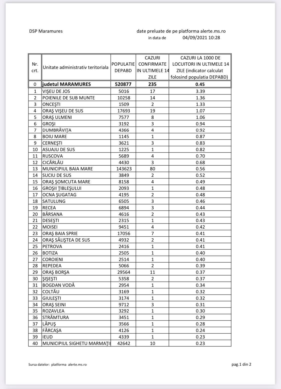 Situația tinde să devină chiar îngrijorătoare. Cifrele au crescut foarte mult, aproape că s-au dublat în numai patru zile, iar aici ne referim atât la numărul de cazuri la nivel județean cât și la nivelul municipiului Baia Mare. Ca atare, incidențele au crescut și ele, aproape că s-au dublat. La fel a crescut considerabil și numărul UAT-urilor care au înregistrat cel puțin un caz. Sunt posibile deja restricții în unele UAT-uri. După cum se vede Vișeu de Jos a depășit deja pragul de 3 cazuri de COVID-19 la mia de locuitori. Din cele 235 cazuri de COVID-19 înregistrate în două săptămâni, 120 sunt numai în două zile, 59 în 3 septembrie și 61 în 4 septembrie.