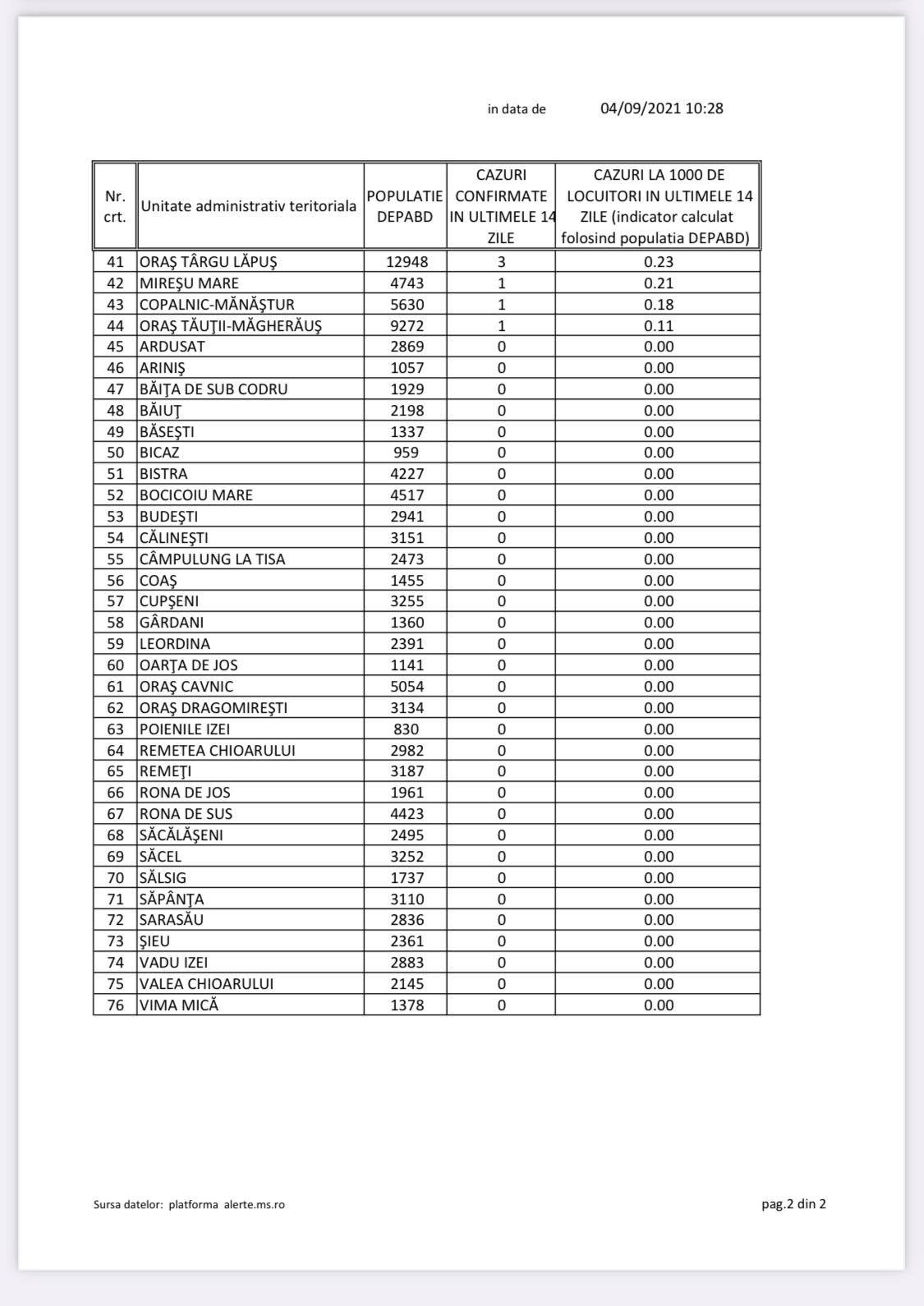 Cele mai multe cazuri se înregistrează desigur în reședința de județ, municipiul Baia Mare, întrucât este unitatea administrativ-teritorială cu cei mai mulți locuitori. Vorbim despre 80 cazuri în două săptămâni, incidența ajungând în municipiul Baia Mare la 0,56 cazuri de COVID-19 la mia de locuitori.