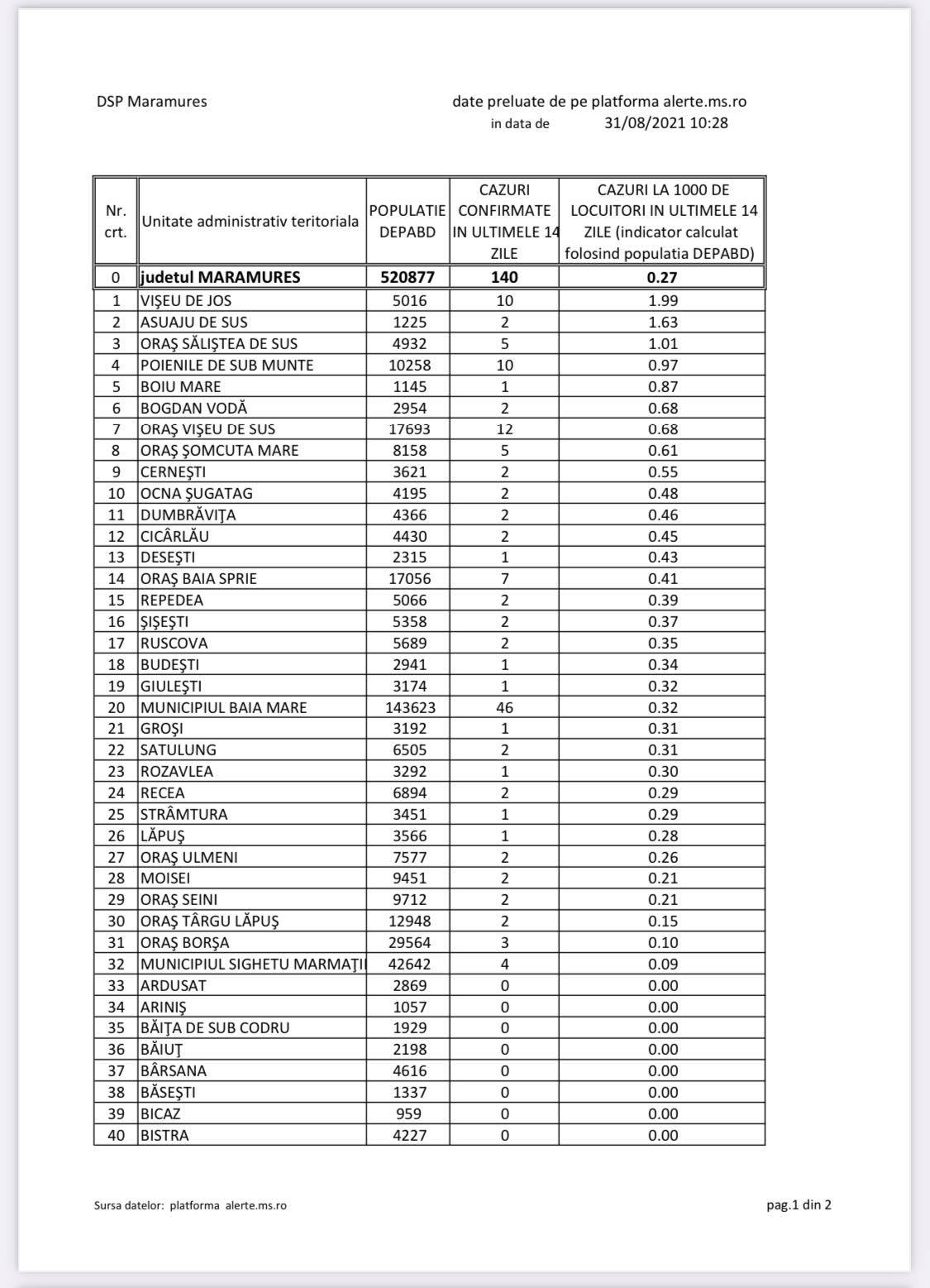 Cele mai multe cazuri se înregistrează desigur în reședința de județ, municipiul Baia Mare, întrucât este unitatea administrativ-teritorială cu cei mai mulți locuitori. Vorbim despre 46 cazuri în două săptămâni, incidența ajungând în municipiul Baia Mare la 0,32 cazuri de COVID-19 la mia de locuitori.