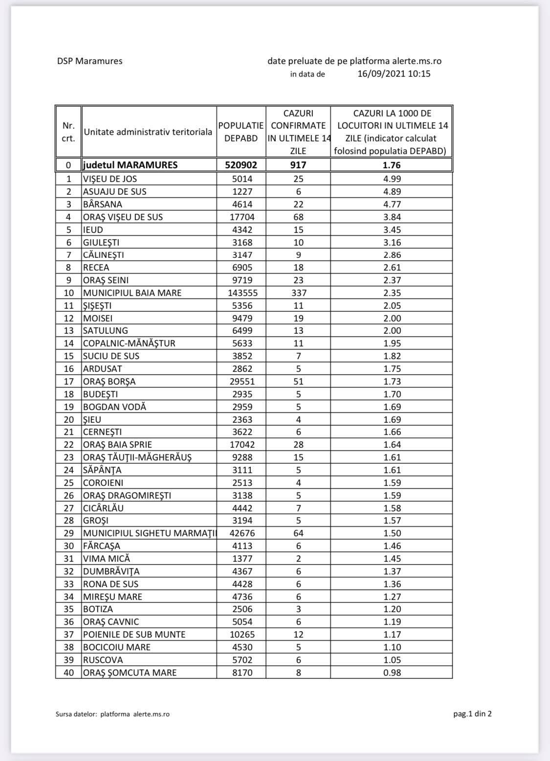 Cu toate acestea reședința de județ are o incidență mult mai mică raportată la mia de locuitori față de celelalte unități administrativ-teritoriale (UAT) care au înregistrat cazuri în aceste două săptămâni. În Maramureș s-au confirmat cazuri în 62 UAT-uri, și aici existând o creștere considerabilă, iar municipiul Baia Mare se află pe locul 10. Pe primele cinci locuri în topul incidenței se află patru comune și un oraș, respectiv Vișeu de Jos, Asuaju de Sus, Bârsana, Vișeu de Sus, Ieud. Avem în 16 septembrie 13 UAT-uri în două seturi, unde sunt instituite măsuri suplimentare de protecție iar aici ne referim la Vișeu de Jos, Vișeu de Sus, Asuaju de Sus, Ieud, Giulești și Bârsana, respectiv Baia Mare, Seini, Șișești, Călinești, Satulung, Moisei și Recea. La cum arată lucrurile putem să ne așteptăm la mai multe situații în intervalul viitor, întrucât tendința este tot de creștere a numărului de cazuri.