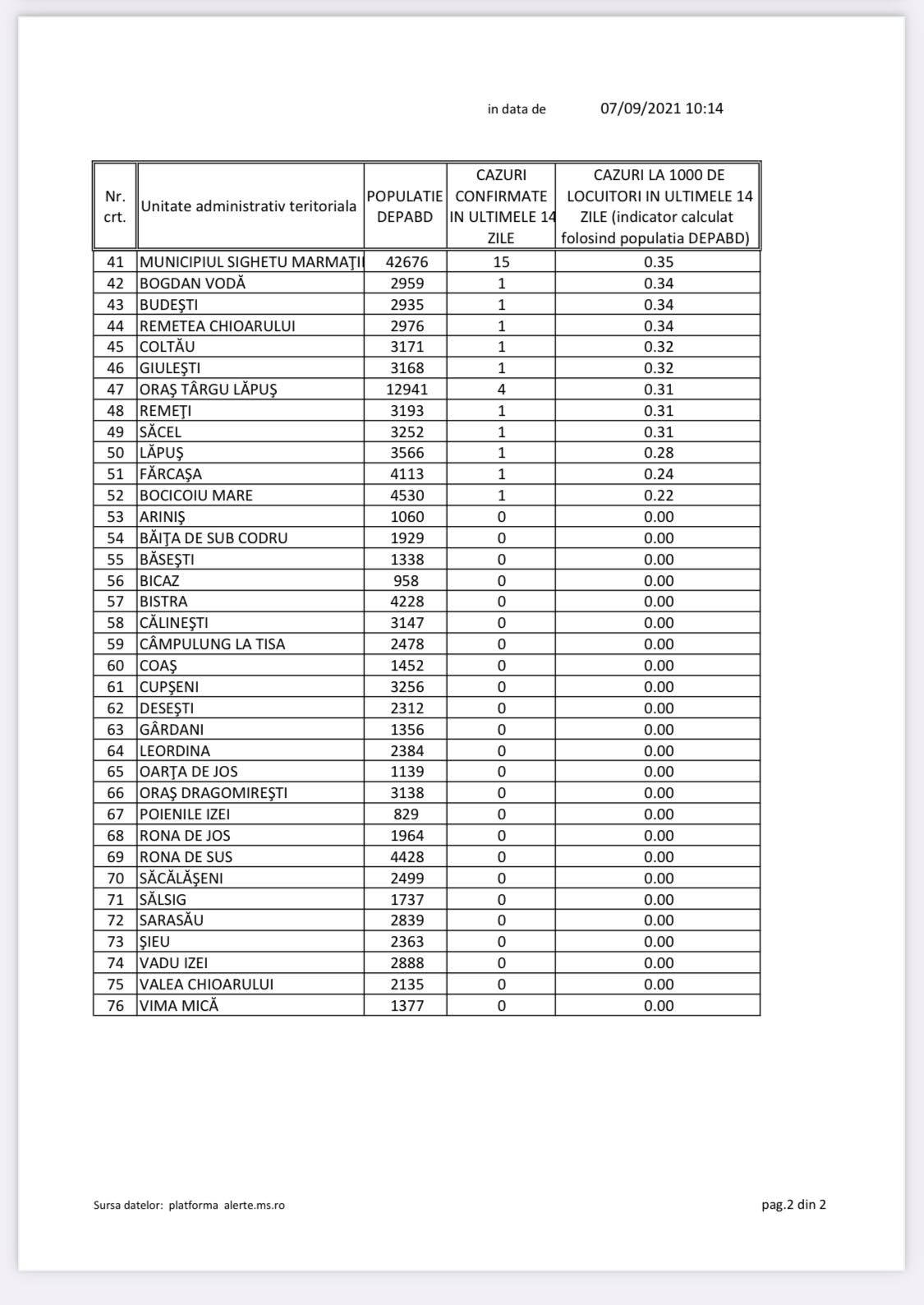 Cu toate acestea reședința de județ are o incidență mult mai mică raportată la mia de locuitori față de celelalte unități administrativ-teritoriale (UAT) care au înregistrat cazuri în aceste două săptămâni. În Maramureș s-au confirmat cazuri în 52 UAT-uri, și aici existând o creștere considerabilă, iar municipiul Baia Mare se află pe locul 15. Pe primele cinci locuri în topul incidenței se află patru comune și un oraș, respectiv Vișeu de Jos, Ieud, Vișeu de Sus, Oncești, Bârsana. Avem din 7 septembrie primul UAT unde sunt instituite măsuri suplimentare de protecție, iar aici ne referim la Vișeu de Jos.