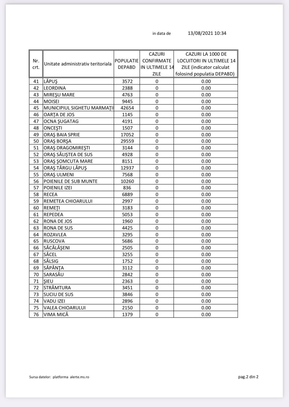 Din numărul de 9 cazuri noi confirmate astăzi în Maramureș, niciunul nu a fost confirmat cu varianta nouă, tulpina Delta. În județul nostru au fost în total 5 cazuri de COVID-19 cu tulpina Delta, din care 4 au fost deja vindecați și externați. În total, în 2 săptămâni, în județul nostru, s-au înregistrat 31 cazuri de COVID-19 indiferent de tulpină, din care cele mai multe au fost în Baia Mare, 14 la număr. Cea mai mare incidență se regăsește în Bogdan Vodă, care are 1,02 cazuri la mie, cu 3 cazuri în 2 săptămâni. Incidența județeană este mică, ceea ce este bine, și bine este că în 65 unități administrativ-teritoriale nu s-au înregistrat cazuri în cele mai recente două săptămâni! Iată cifrele atașate textului!