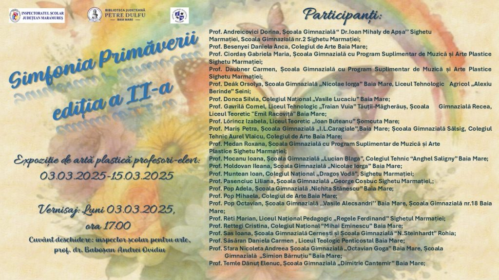 Luni, 3 martie 2025, la ora 17:00, Sala Salonului Artelor, situat în incinta Bibliotecii Județene „Petre Dulfu” dinBaia Mare, va fi locul unde arta și primăvara se întâlnesc într-o expoziție specială. Inspectoratul Școlar Județean Maramureș, în colaborare cu Biblioteca Județeană „Petre Dulfu” Baia Mare, organizează vernisajul expoziției de artă plastică „Simfonia primăverii”, ediția a II-a.