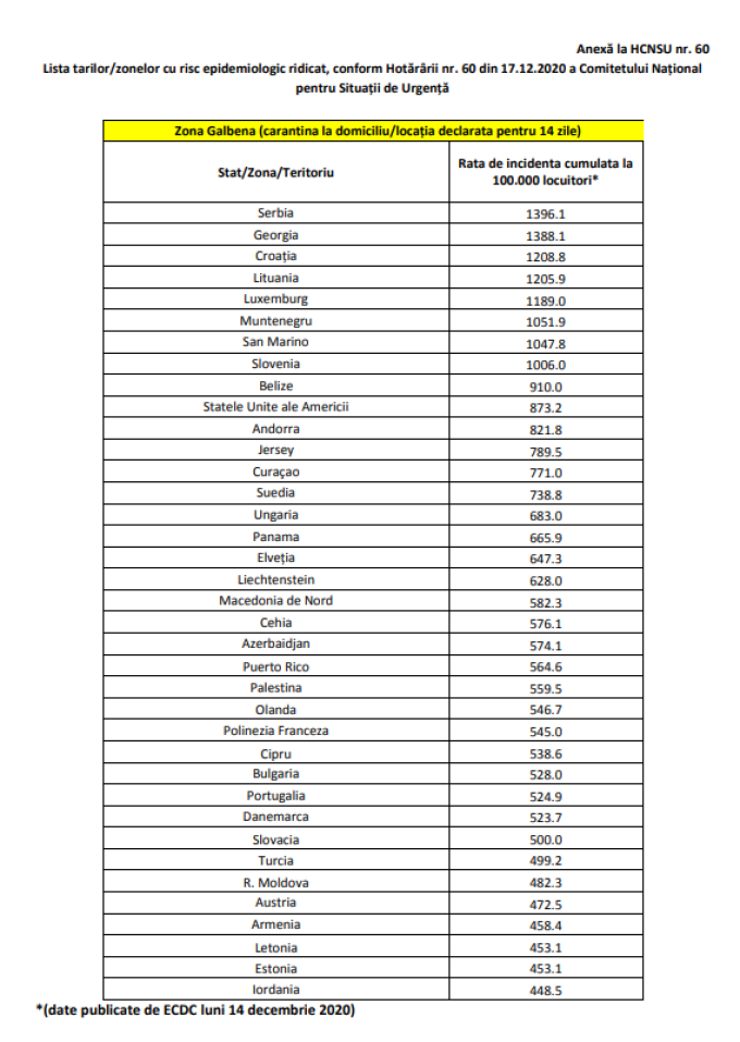 Comitetul Național pentru Situații de Urgență a actualizat lista ţărilor cu risc epidemiologic ridicat. Cei care vin din aceste state trebuie să intre în carantină pentru 14 zile.