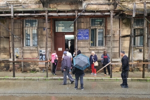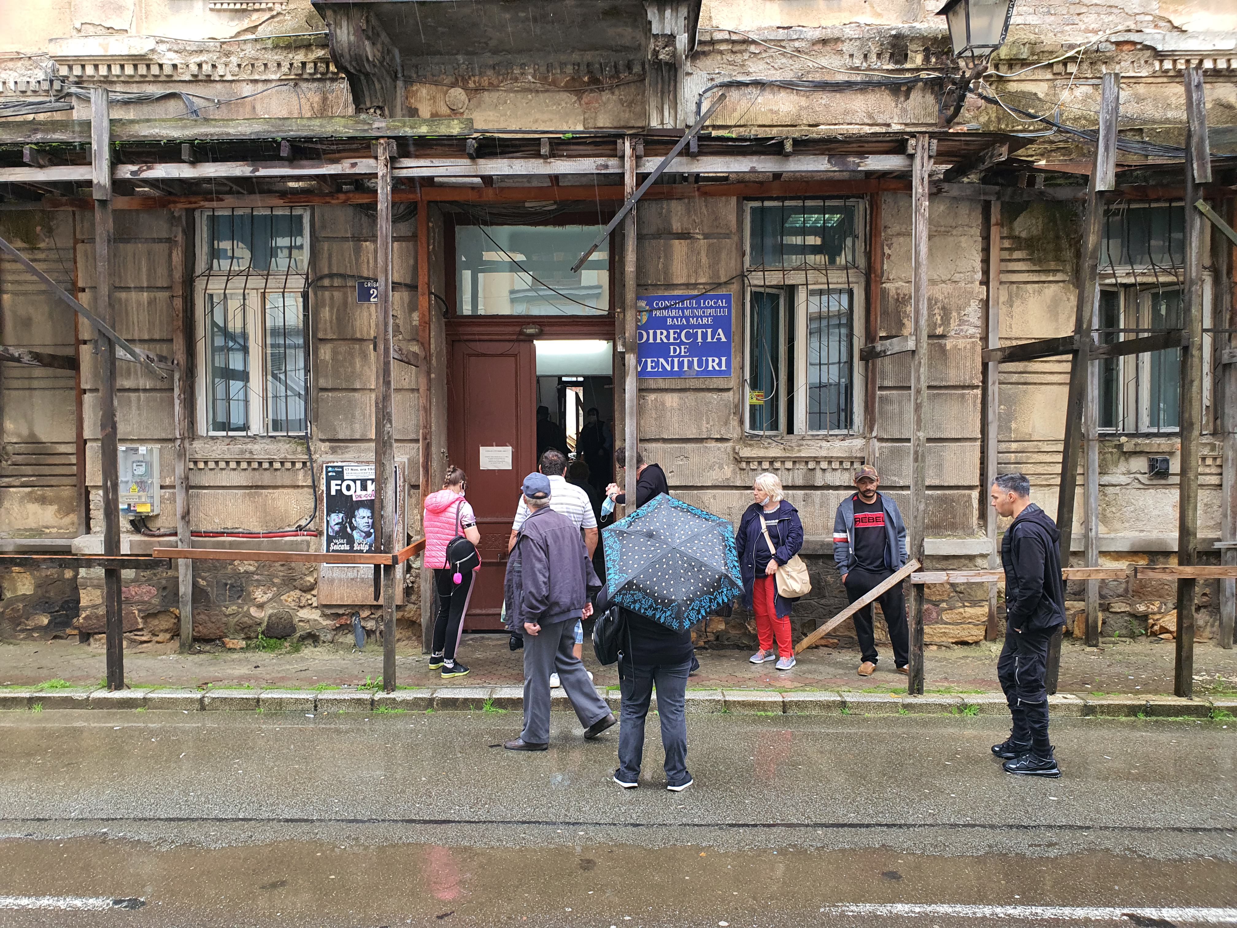 Însă, în pofida vremii mohorâte, unii băimăreni au fost nevoiți să iasă din case ori din spațiile unde muncesc, împinși de nevoile zilnice. Chiar lângă cele două piațete din Orașul Vechi, se află Direcția de Venituri a primăriei. Și în această dimineață, s-a format coadă afară, la intrarea în această Direcție a administrației locale. Oamenii doreau să obțină un certificat fiscal pe care primăria este obligată legal să îl emită și care le este foarte trebuincios în a-și rezolva problemele lor personale. Pentru că în interior sunt primiți (la casierie!) doar cetățenii care vin pentru a plăti dările la bugetul local, ceilalți sunt puși în așteptare afară, pe trotuar, în ploaie și sub eternele schele de la Direcția de Venituri, care au devenit simbol al actualei administrații pentru condițiile și tratamentul de care se “bucură” contribuabilii care alimentează bugetul local.