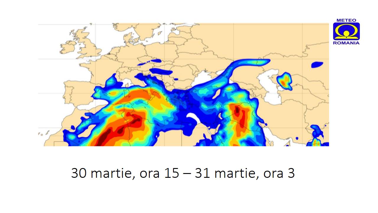 În perioada 30 martie – 01 aprilie circulația aerului se va face din sector preponderent sud-vestic și sudic, iar spre final vestic, astfel că va favoriza avansul dinspre nordul Africii a unei mase de aer tropical, încărcată cu particule de praf cu origine sahariană, îndeosebi către sudul și sud-estul Europei, inclusiv în zona țării noastre.