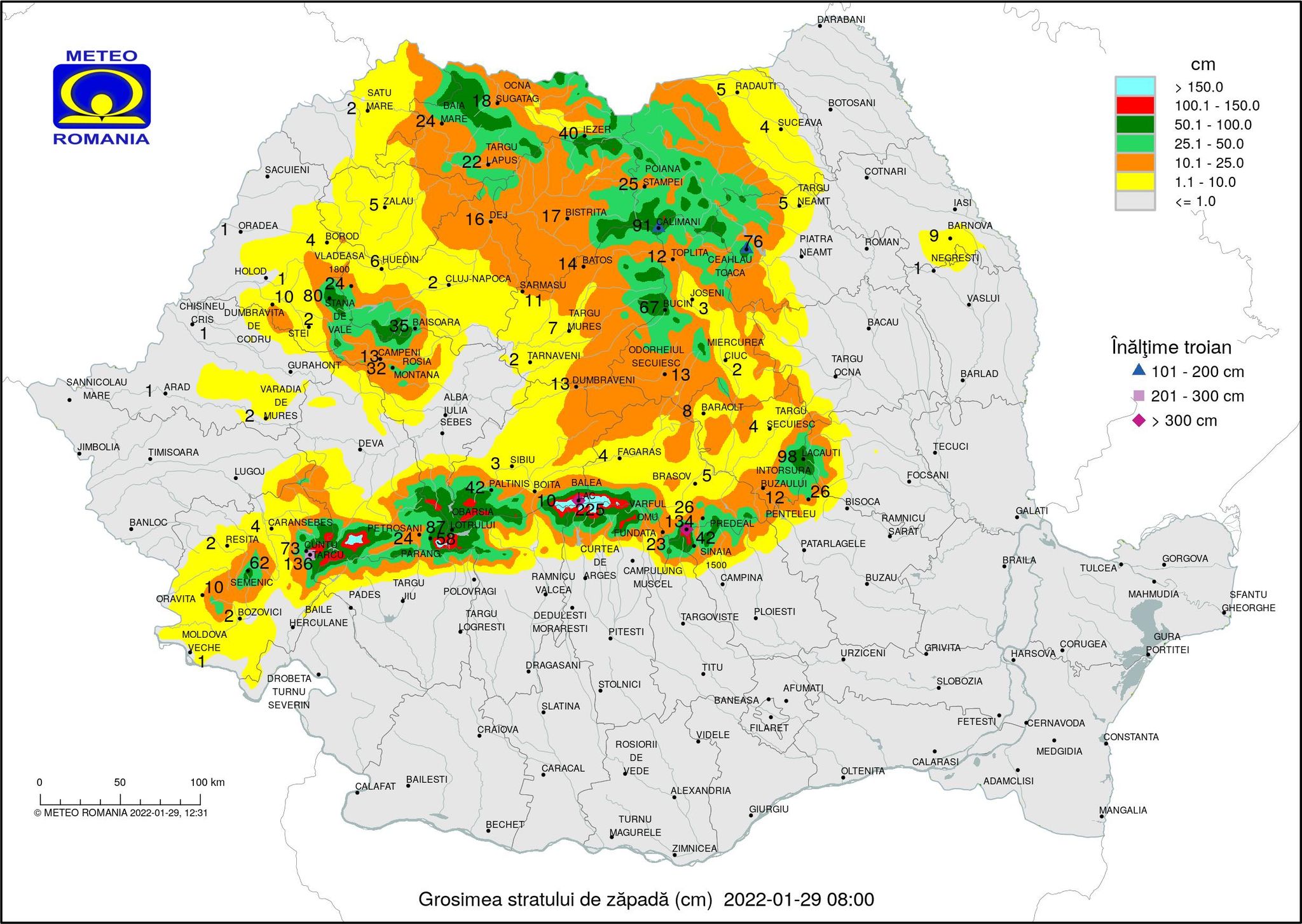 Stratul de zapada masura pana la 40 cm la statia meteo Iezer,44 cm la Firiza, 38 cm in Pasul Gutai, 36 cm la Cavnic, 30 cm in Baia Borsa, 27 cm in Poiana Borsa, 22 cm la Targu Lapus, 24 cm in Baia Mare, 18 cm la Ocna Sugatag, 16 cm la Sighetu Marmatiei. De altfel, în prezent, municipiul Baia Mare este reședința de județ cu cel mai mare strat de zăpadă din țară.Ar fi de adăugat că în aria montană înaltă situată la nordul municipiului Baia Mare, sunt valori de peste 50 cm, arată materialul Administrației Naționale de Meteorologie care poate fi consultat în articolul de față. Debitele si nivelurile cursurilor de apa au fost usor variabile. Gheata este prezenta la malurile raurilor Tisa, Viseu, Vaser, Cisla, Ruscova, Iza, Mara, Cosau, Lapus, Cavnic, Barsau si Nistru. Curg sloiuri de gheata pe raurile Suciu si Somes. Vremea va fi usor mai calda decat normalul termic al perioadei, dar mai rece fata de ieri. Cerul va fi temporar noros. Seara si noaptea trecator va ninge moderat cantitativ pe arii extinse. La munte, izolat cantitatile de apa vor fi mai insemnate. Local se va depune strat nou de zapada, mai consistent in zona de munte.