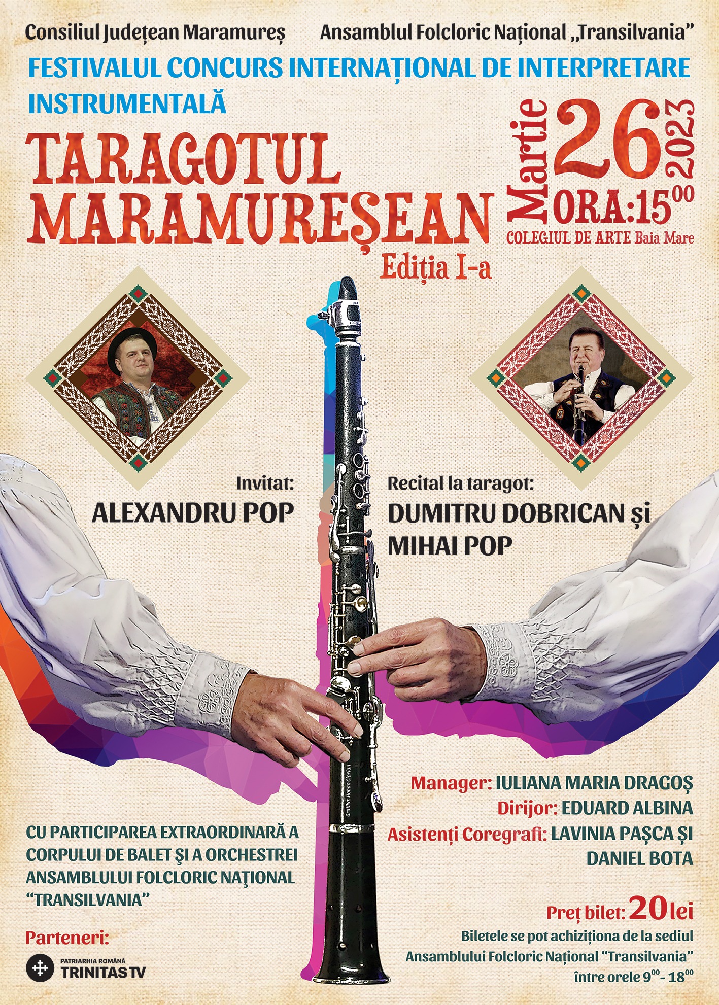 Ansamblul Folcloric Național „Transilvania” organizează prima ediție a Festivalului Concurs „Taragotul Maramureșean”. Aceasta va avea loc duminică, 26 martie, de la ora 15.00, la Colegiul de Arte din Baia Mare.
