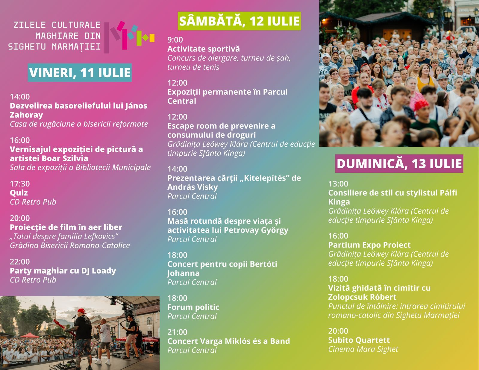 A treia ediție a evenimentului Zilele Culturale Maghiare are loc de vineri până duminică în Sighetu Marmației. Manifestările încep astăzi la ora 14 cu dezvelirea basoreliefului lui Janos Zahoray, la casa de rugăciune a Bisericii Reformate. Tot astăzi va avea loc și o proiecție de film în aer liber, ”Totul despre familia Lefkovics”, în grădina Bisericii Romano-Catolice. Întregul program al manifestărilor îl puteți vedea mai jos.