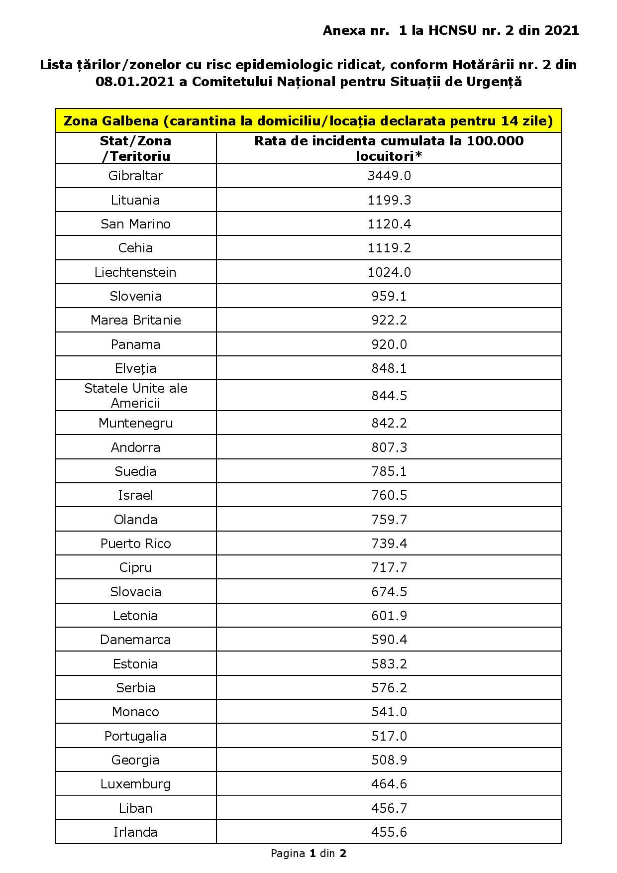 Art.2 – Se aprobă lista țărilor/zonelor/teritoriilor de risc epidemiologic ridicat pentru care se instituie măsura carantinei asupra persoanelor care sosesc în România din acestea, prevăzută în anexa nr. 1.