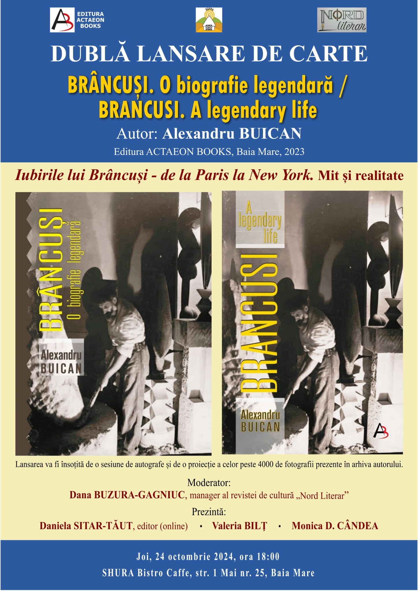 „Editura ACTAEON BOOKS și Revista de Cultură „Nord Literar” vă invită, în prezența autorului, la o dublă lansarea a biografiilor lui Alexandru BUICAN, Brâncuși, o biografie legendară și Brancusi. A Legendary Life, ambele apărute la editura noastră în anul 2023. Nu întâmplător am ales Shura Bistro Caffe, local agreabil, ce promite să devină un lăcaș de cultură al Băii Mari.