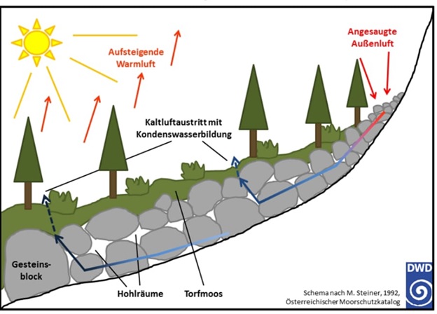 Torfmoos –turbă, Gesteinsblock-blocuri de piatră, Aufsteigende Warmluft-Aer cald , Hohlraeume- Spații goale, Kaltluftauftritt mit Kondenswasserbildung-Ieșire aer rece cu efect de condens al apei, Ausgesaugte Aussenluft – Absobția aerului exterior.